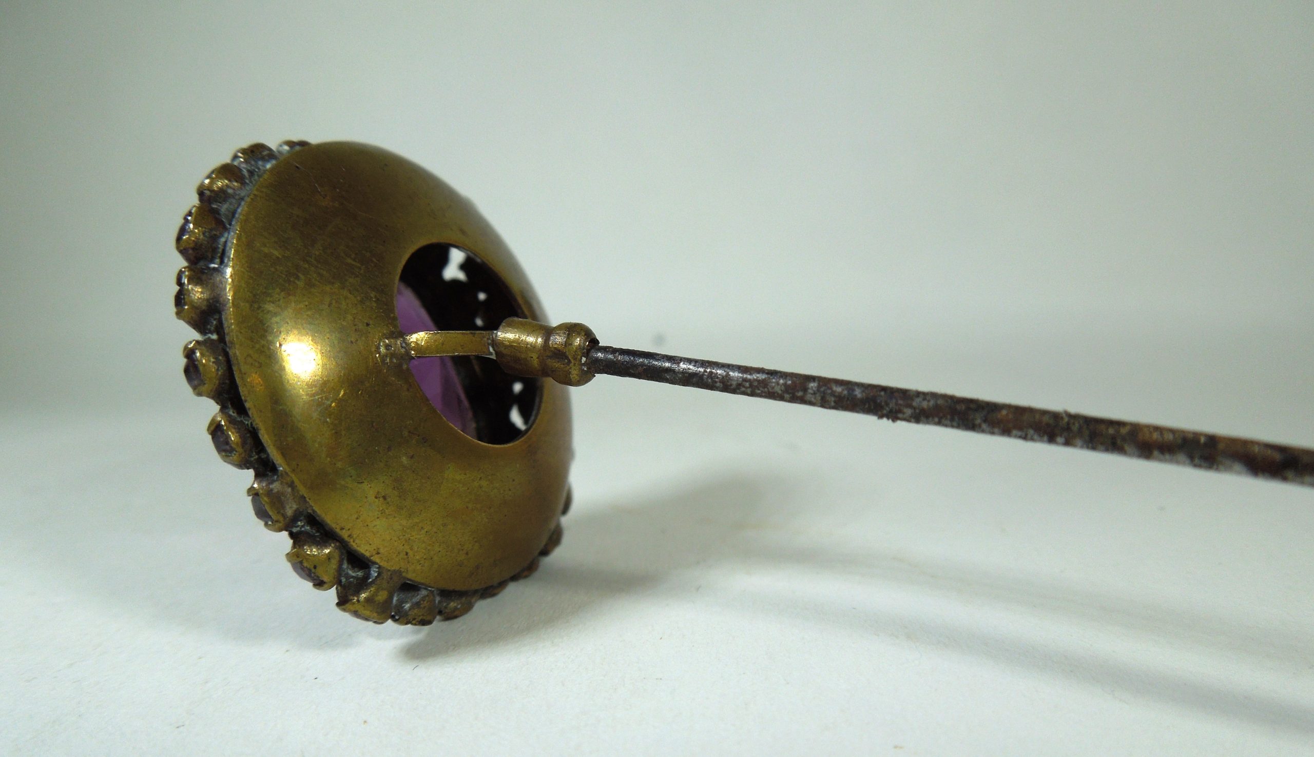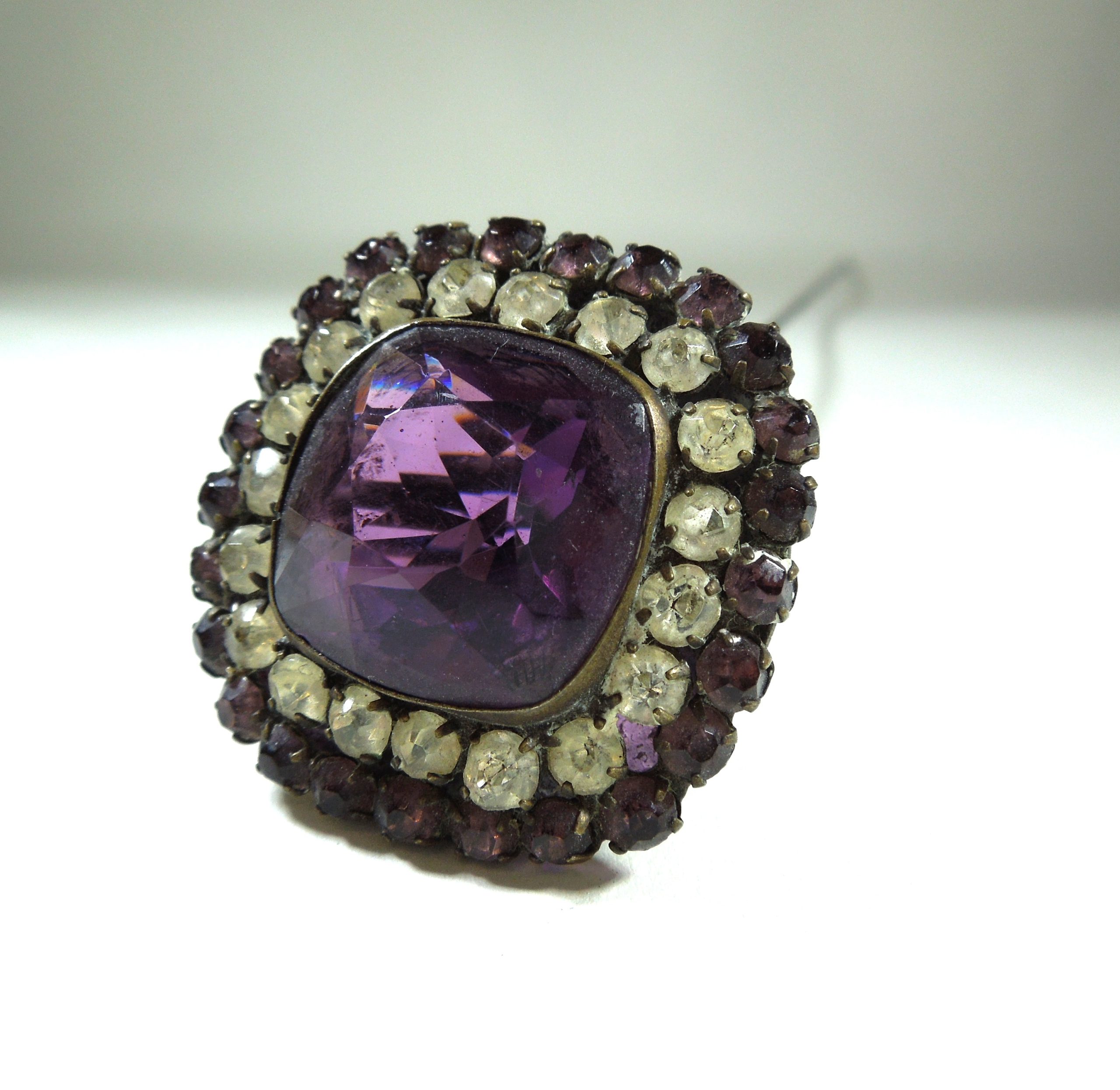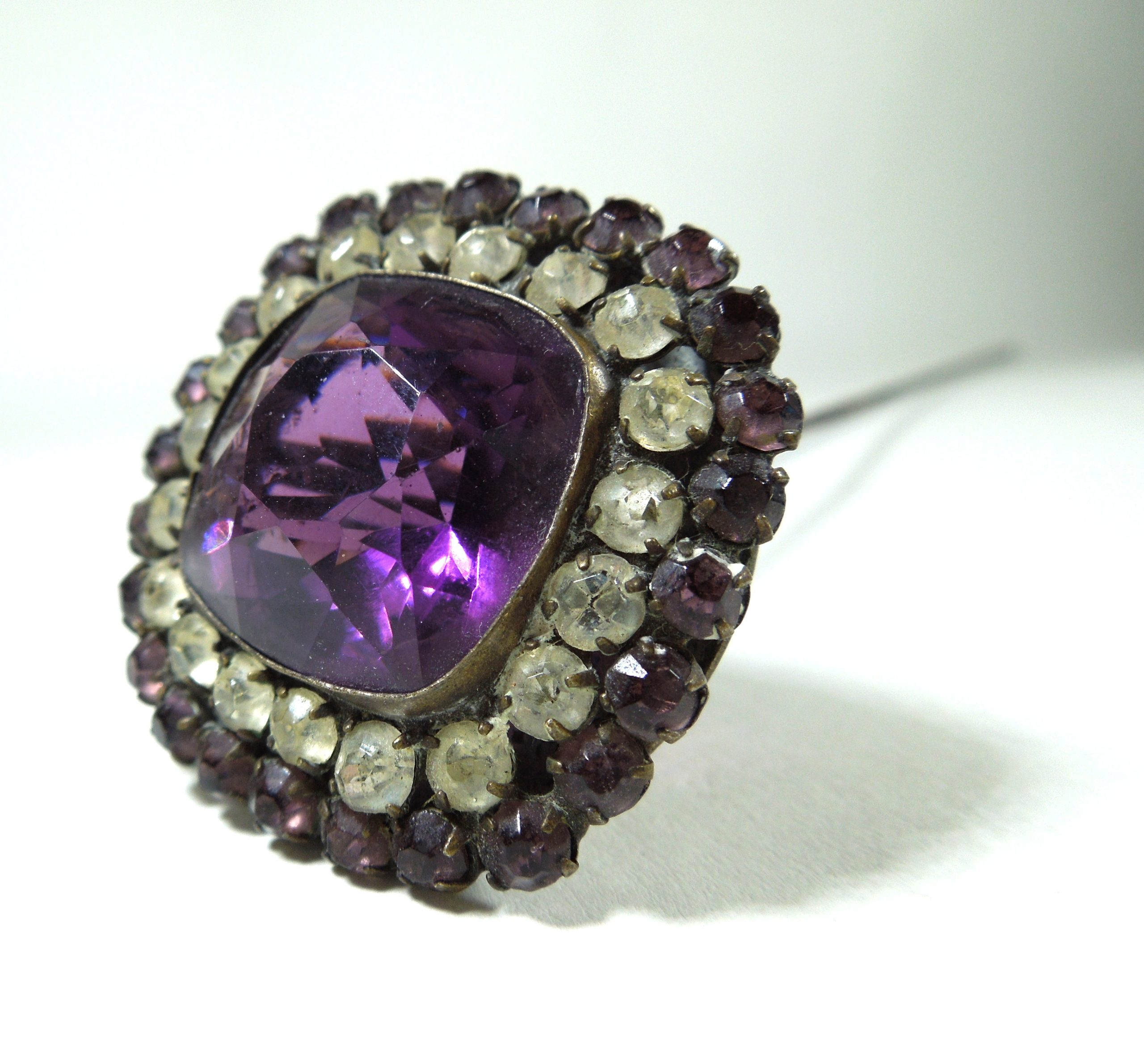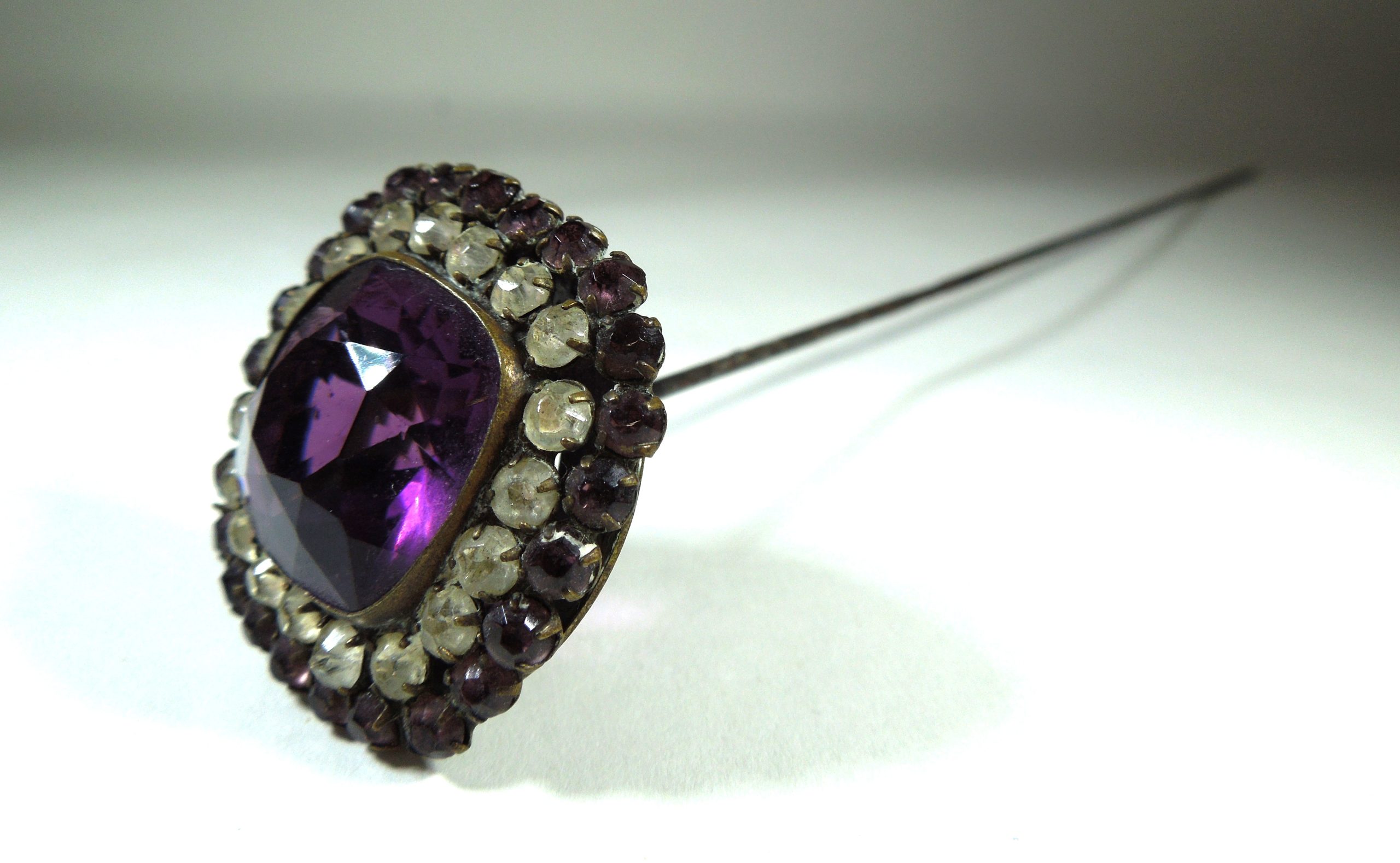 Late Victorian/Edwardian period hatpin with a very long pin. Set with amethyst coloured paste and clear stones, this is a striking accessory for hat-wearing ladies or collectors.