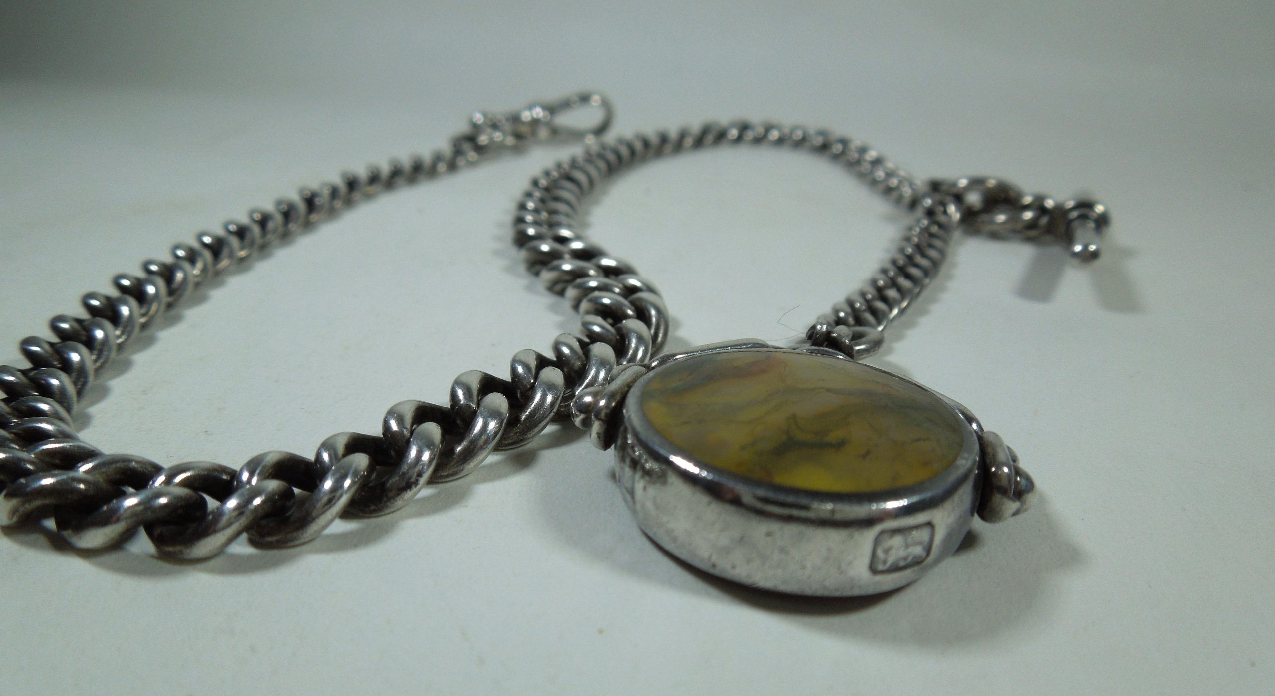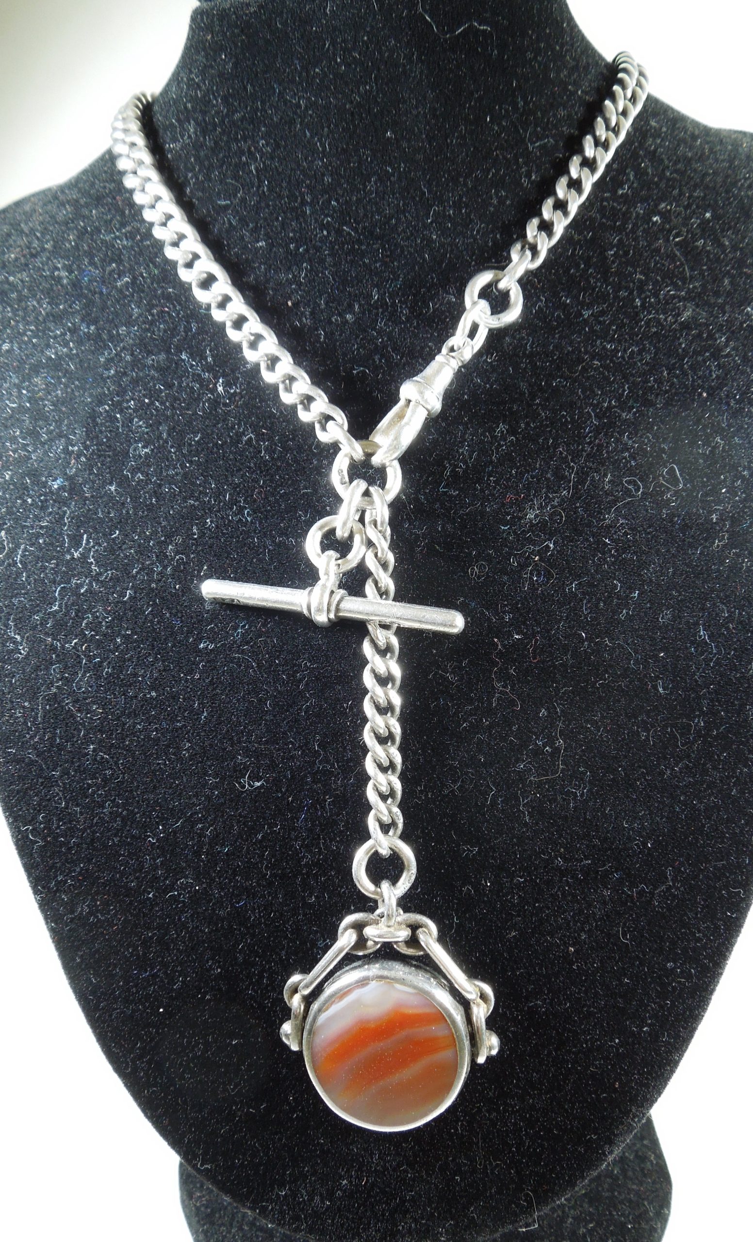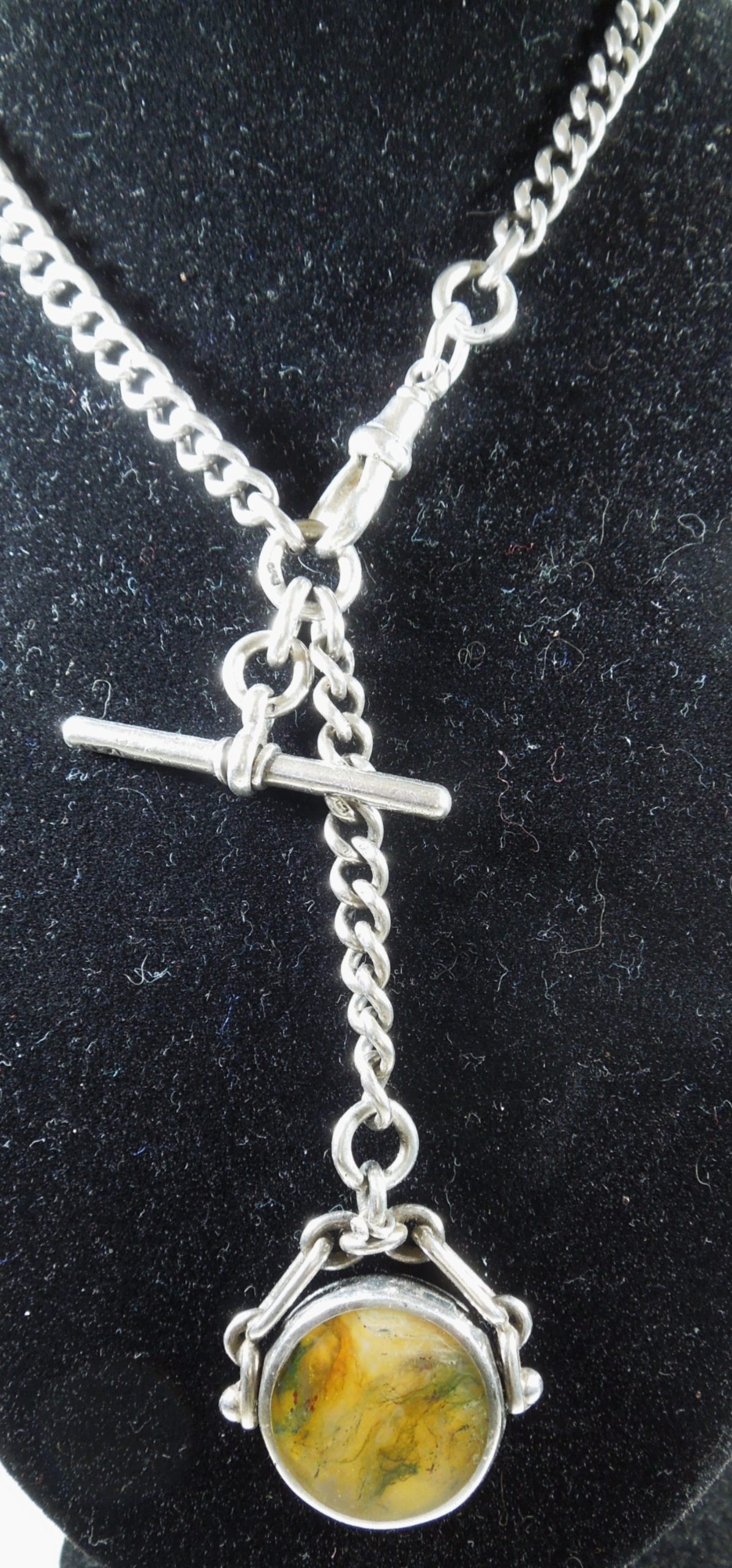 Superb solid English silver hallmarked pocket watch chain. The end of the chain holds a fabulous spinner fob with banded agate on one side and moss agate on the other and the silver casing is hallmarked. Each link of the graduated chain is stamped with the lion passant as is the dog clip. The T-bar is also fully hallmarked for 1891.