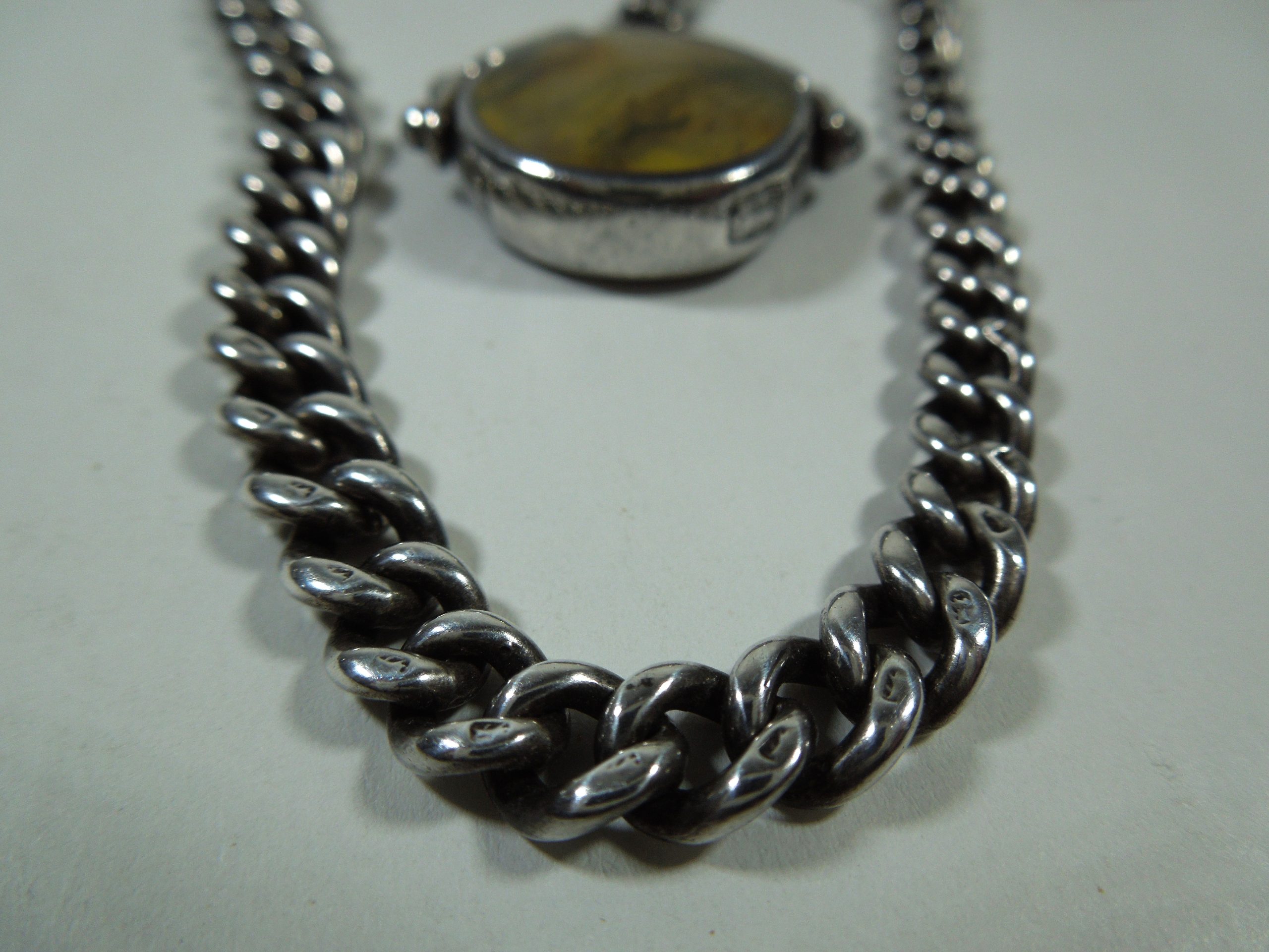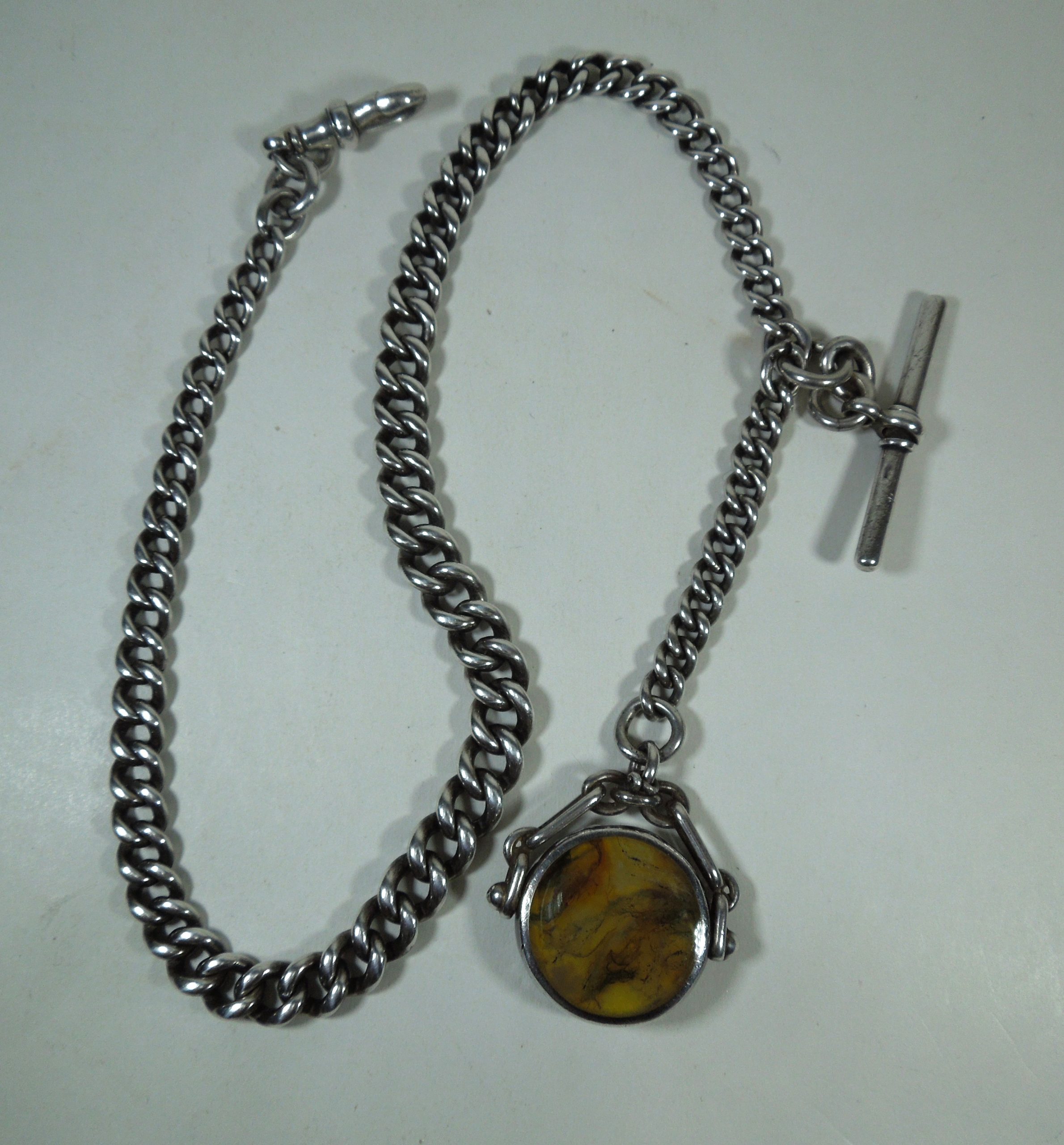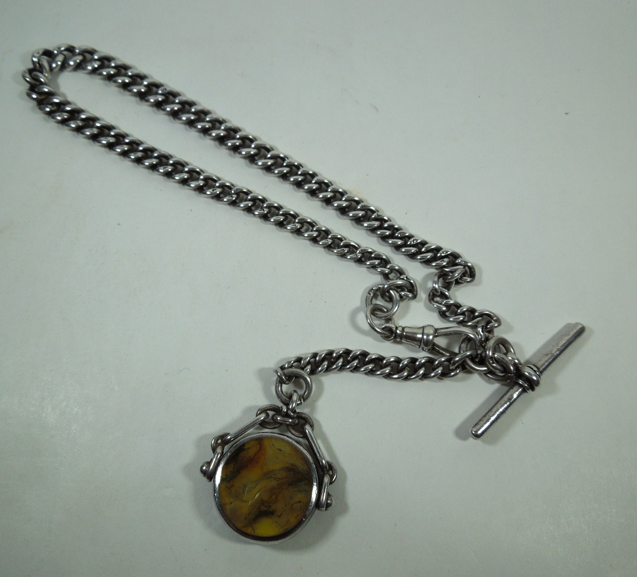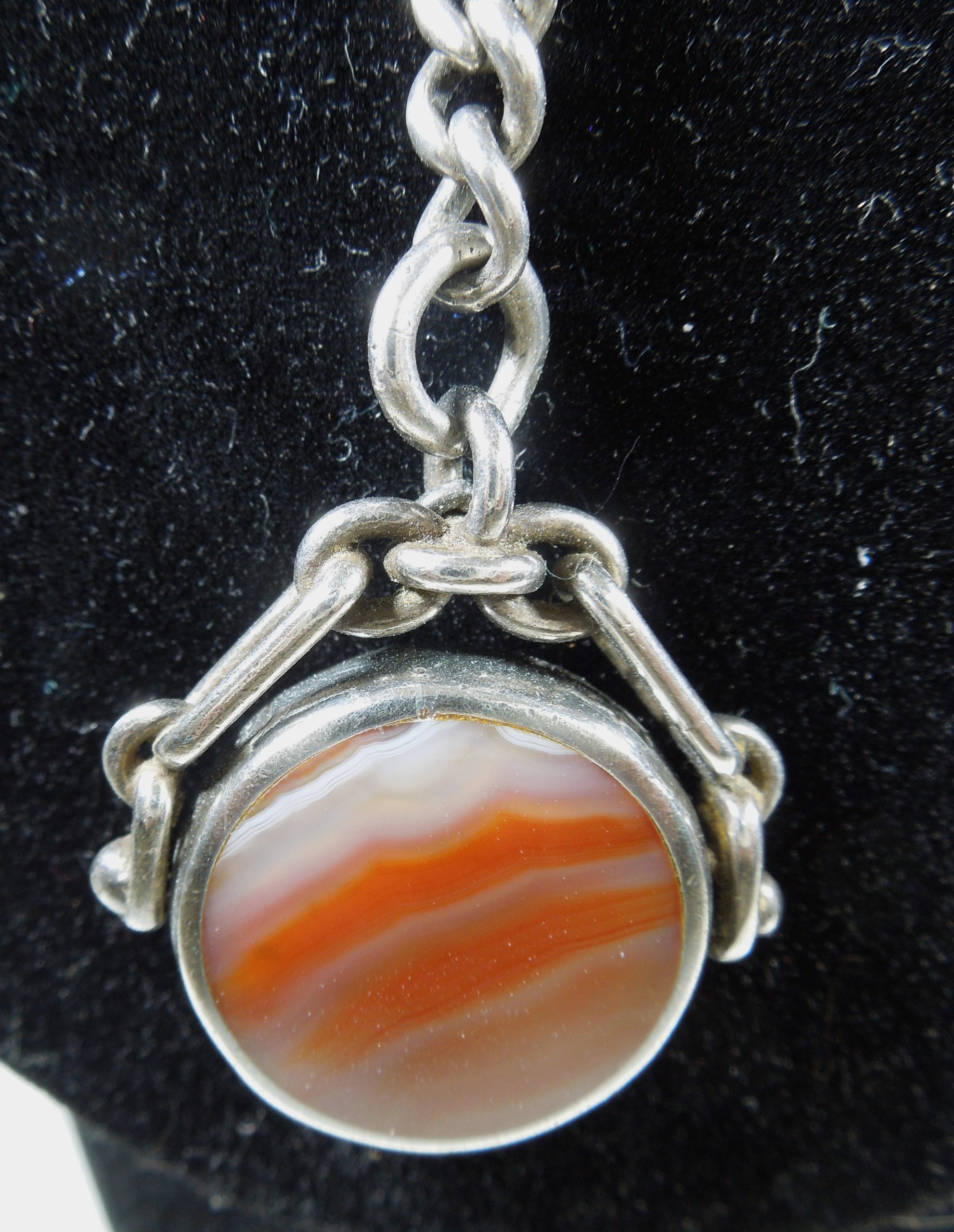 Superb solid English silver hallmarked pocket watch chain. The end of the chain holds a fabulous spinner fob with banded agate on one side and moss agate on the other and the silver casing is hallmarked. Each link of the graduated chain is stamped with the lion passant as is the dog clip. The T-bar is also fully hallmarked for 1891.