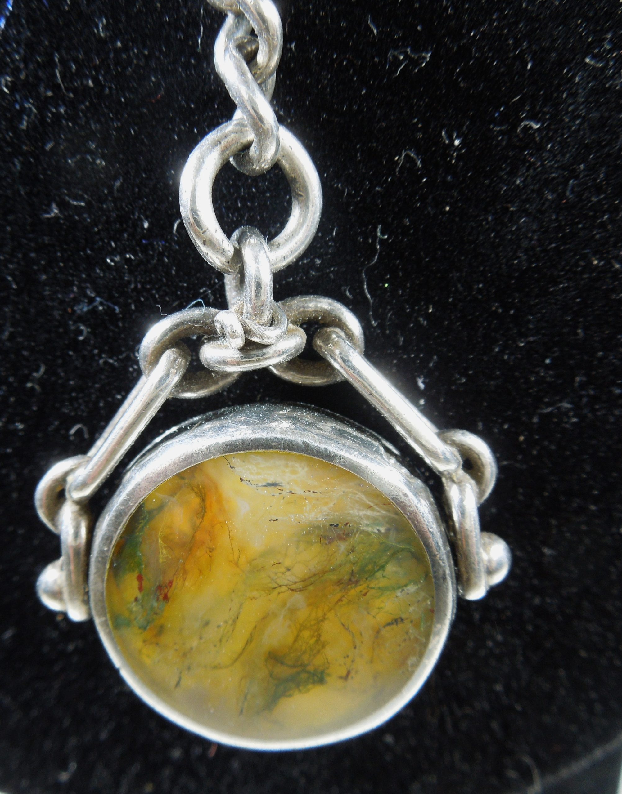 I have never seen such a beautiful piece of moss agate before. You can literally see the fine moss threads weaving through the stone. The banded agate is also striking with rich orange and pale grey streaks. The fob spins within it’s silver setting.