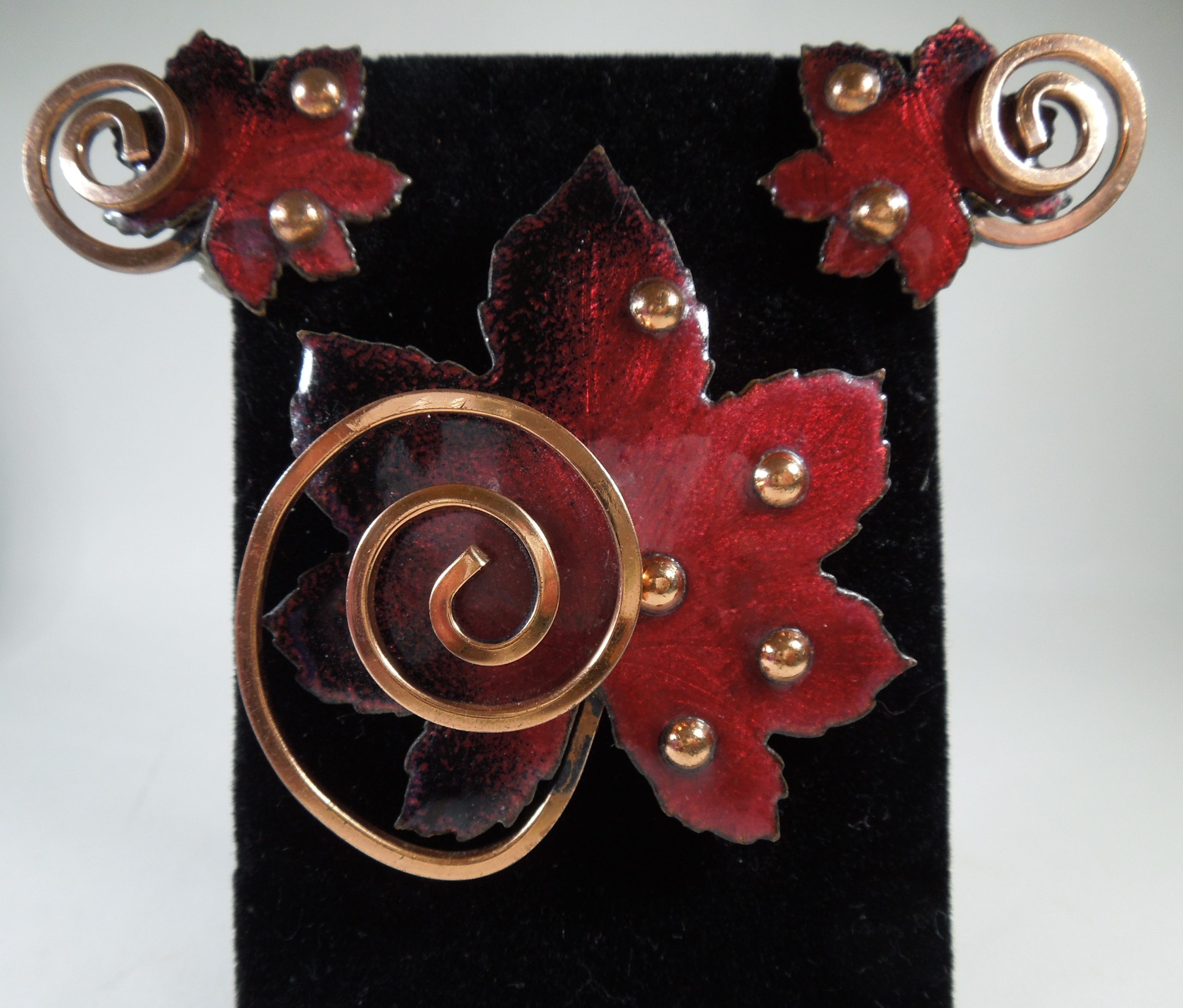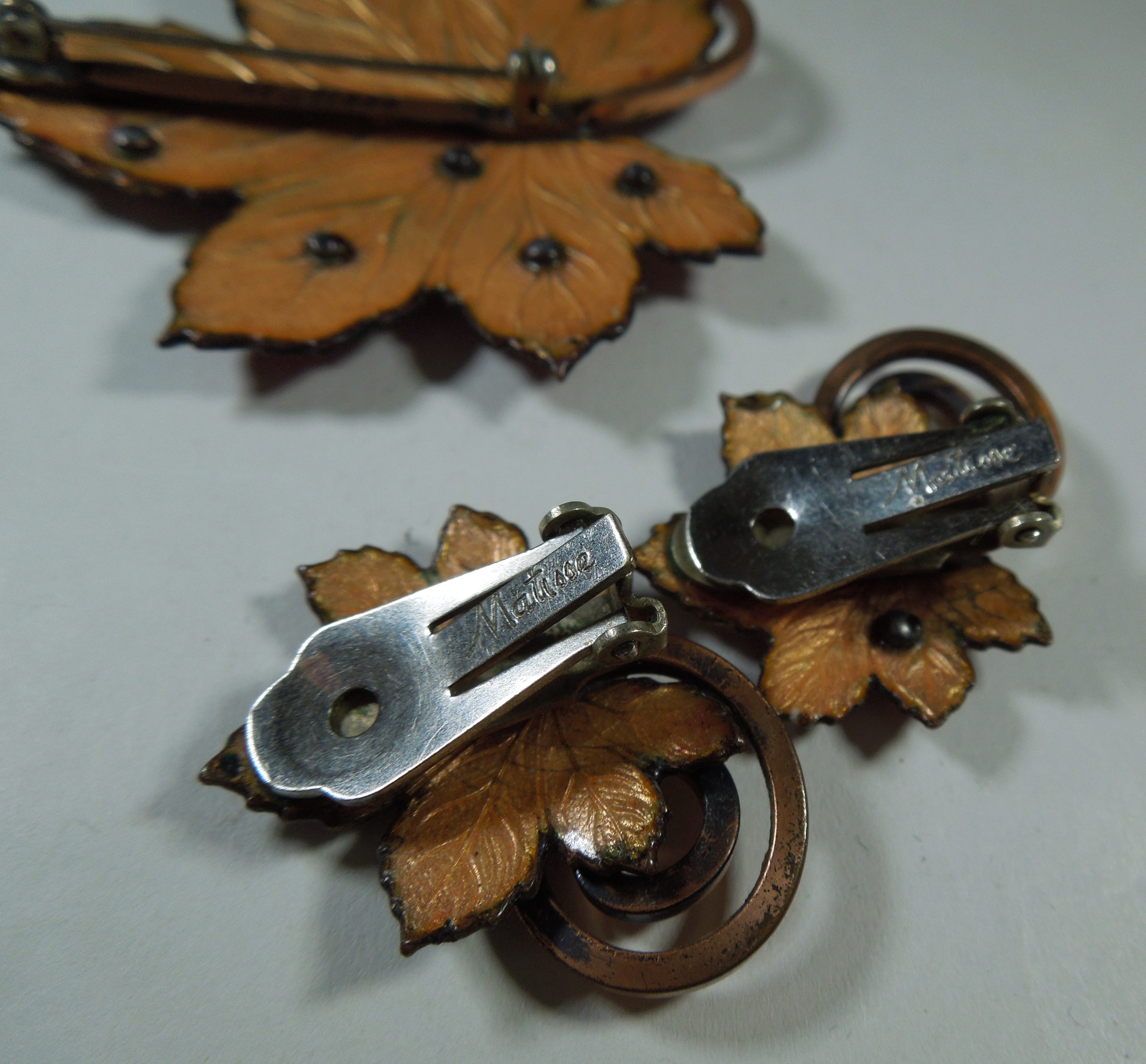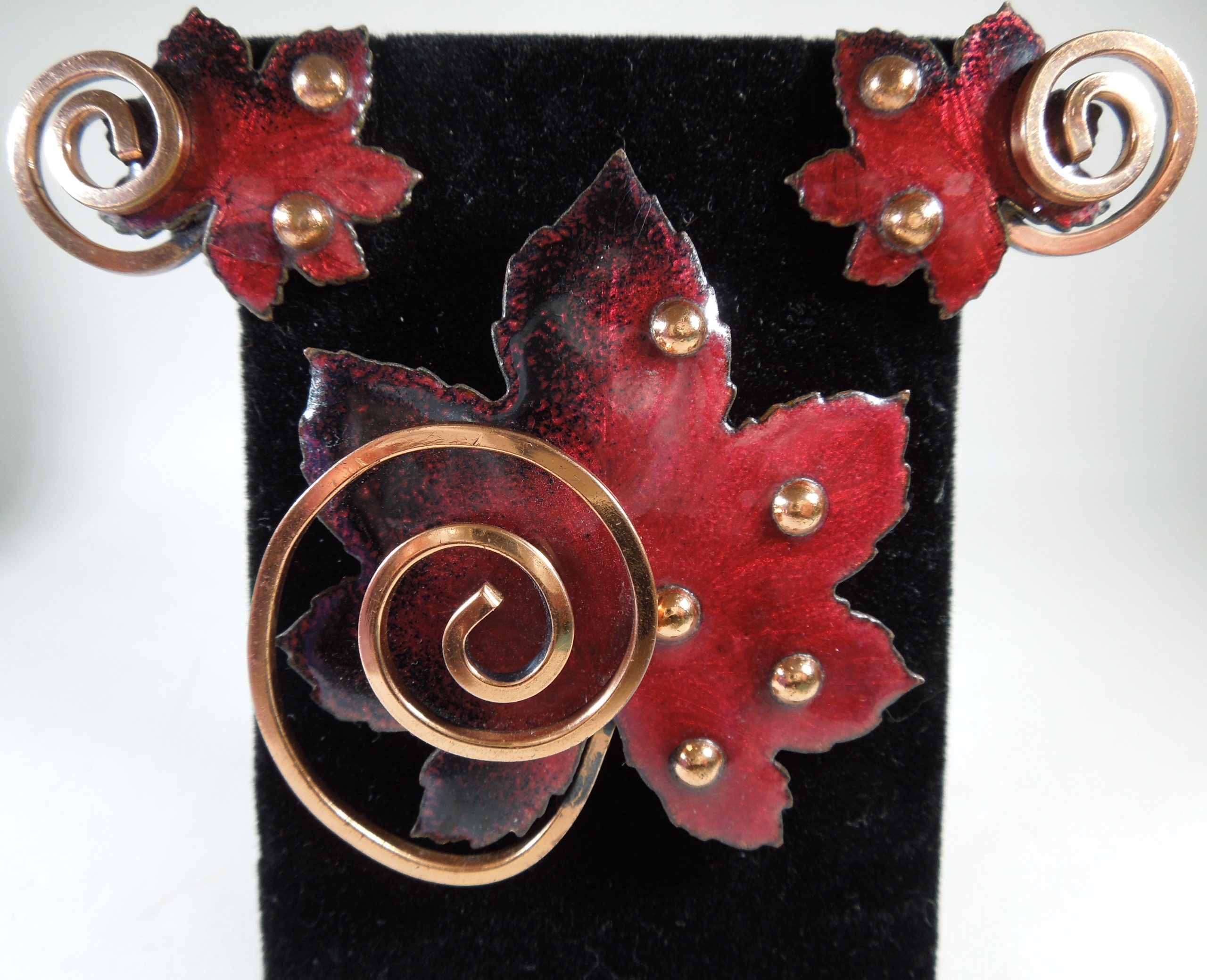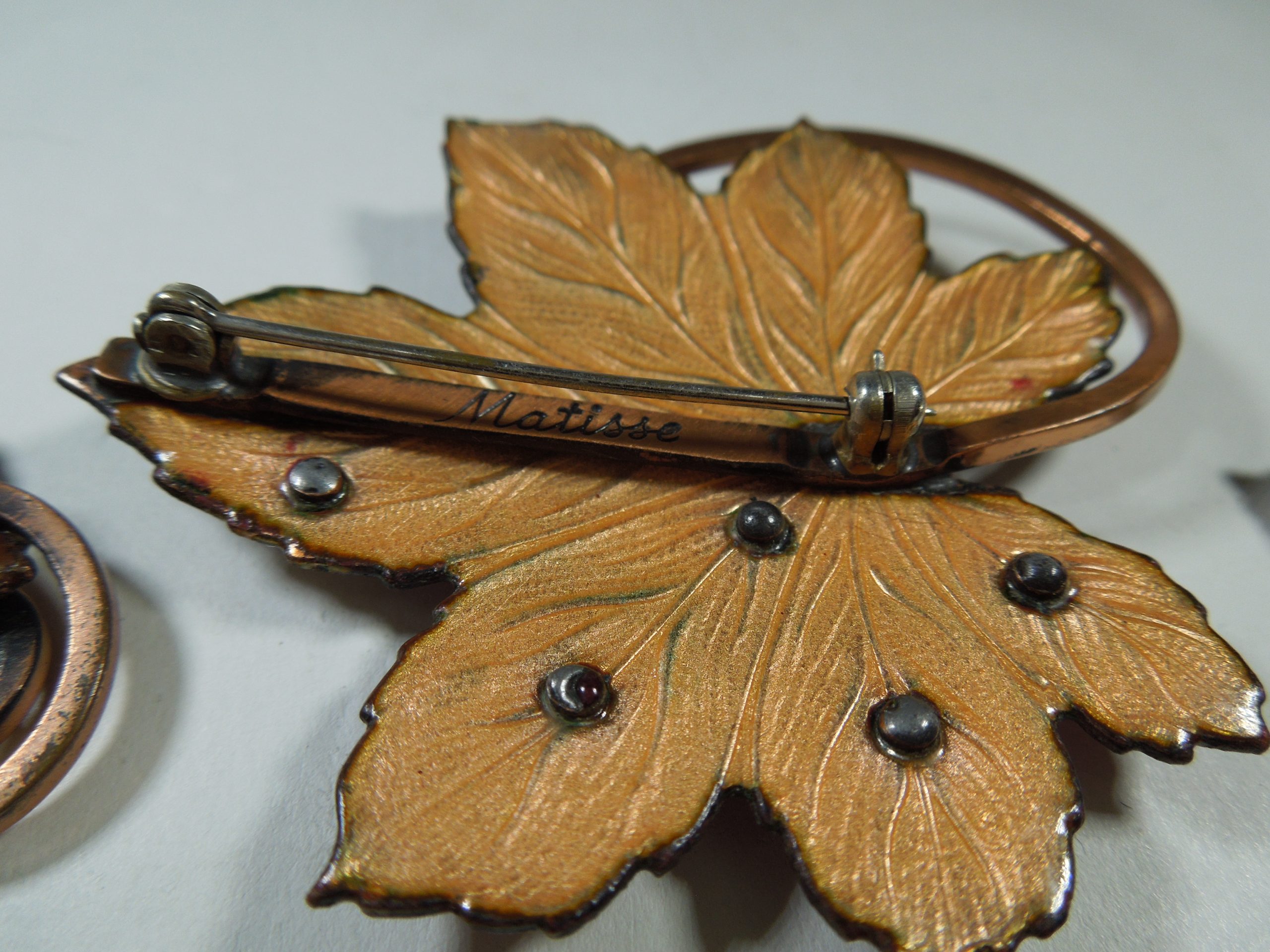 Fabulous 1950’s signed Matisse Brooch and matching Clip-on Earrings. The leaf design is enamelled in deep crimson and adorned with a striking copper swirl and round copper studs. The brooch and earrings are signed Matisse on the back and originated in California, USA.