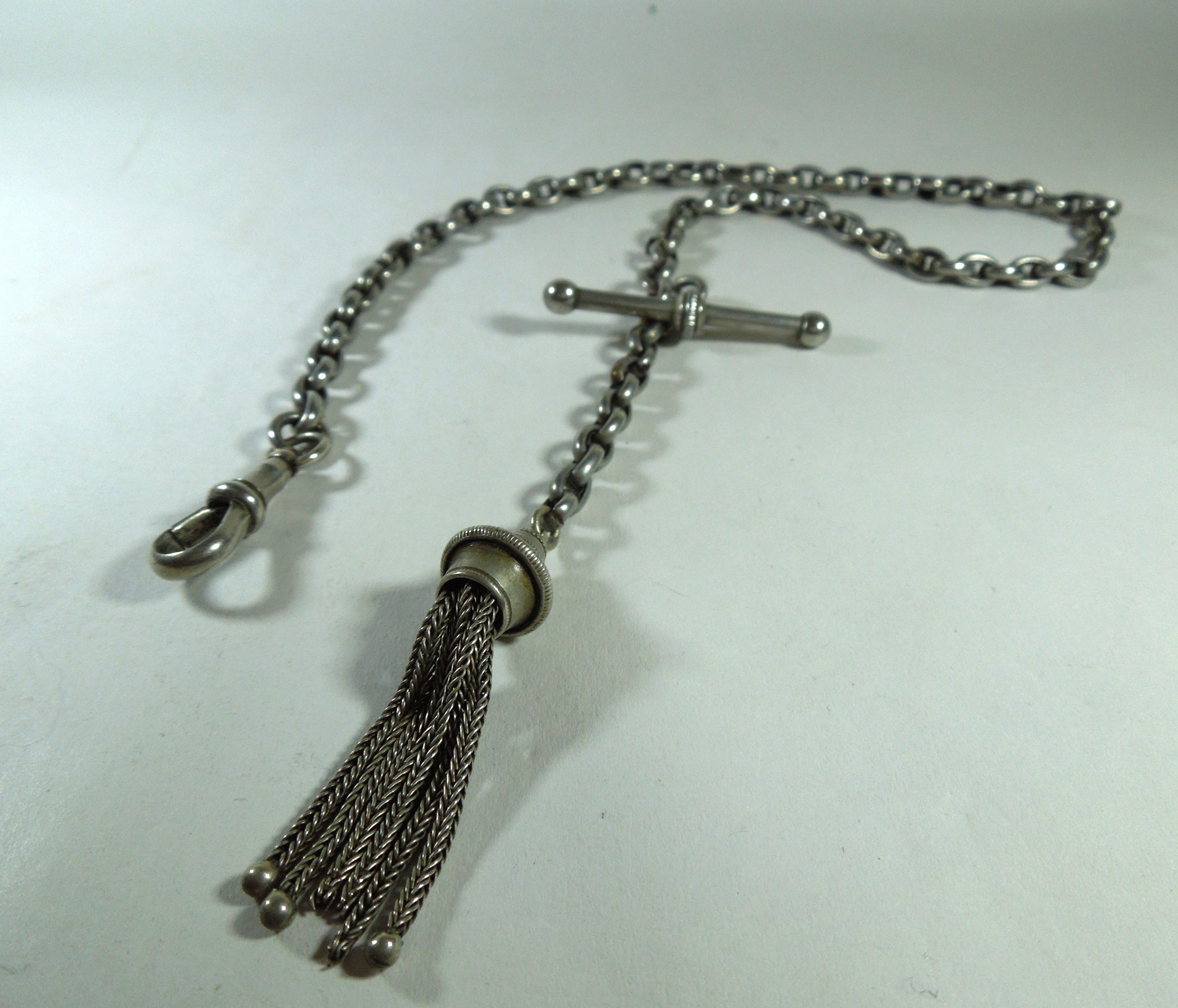 This pocket watch chain is fairly small so would suit a small to medium sized pocket watch. The T-bar has the maker’s initials JR and is attached to the belcher linked chain, a dog clip with a chain tassle at the end.