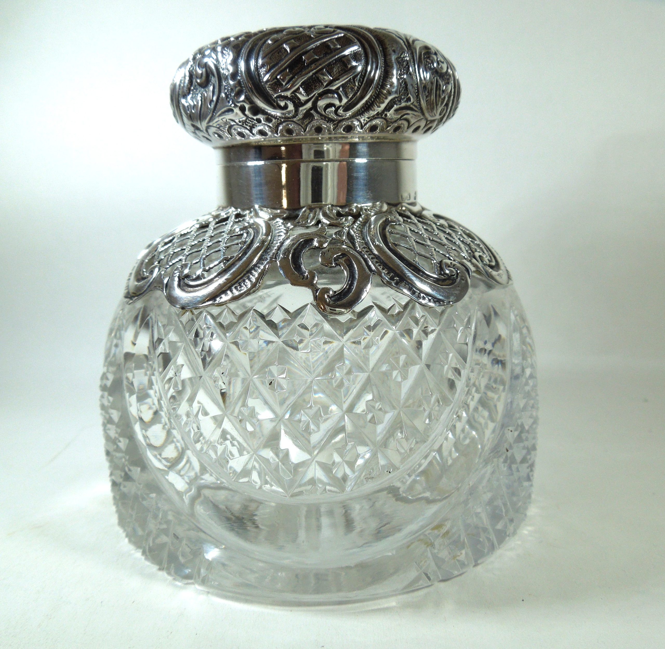 Large Cut Crystal Inkwell with an English hallmarked lid and scrolled decoration. It carries a Birmingham hallmark for 1893 and the maker’s marks HM.