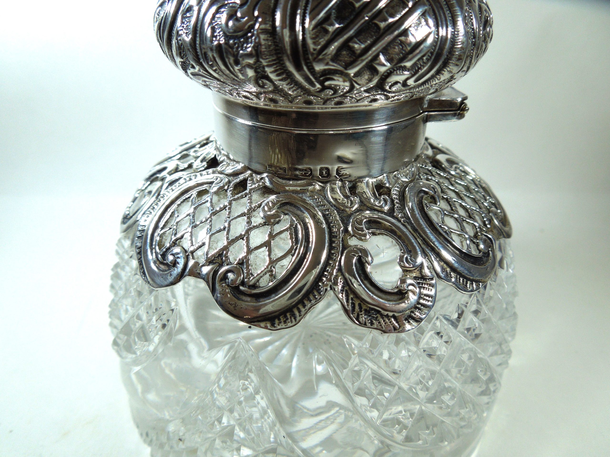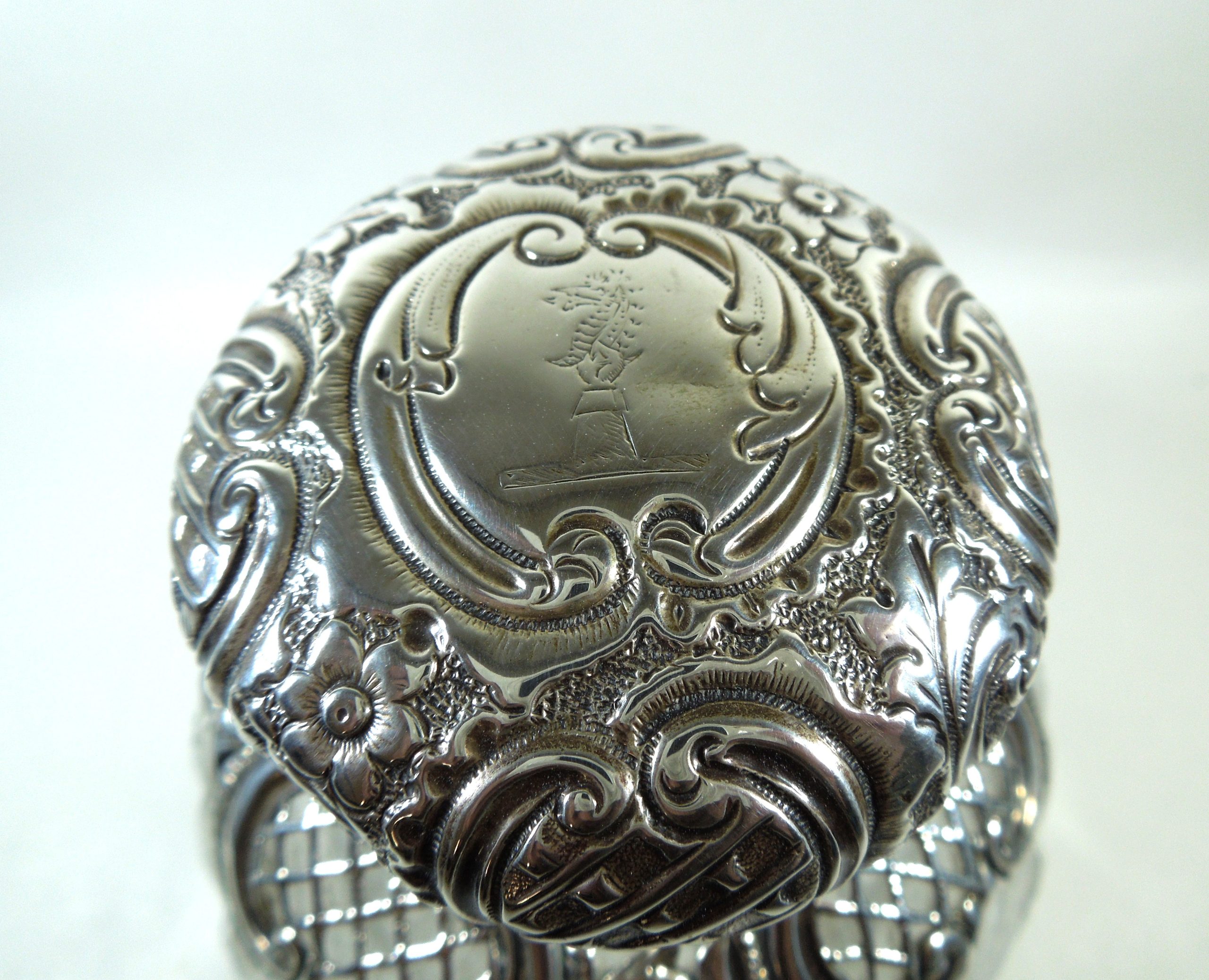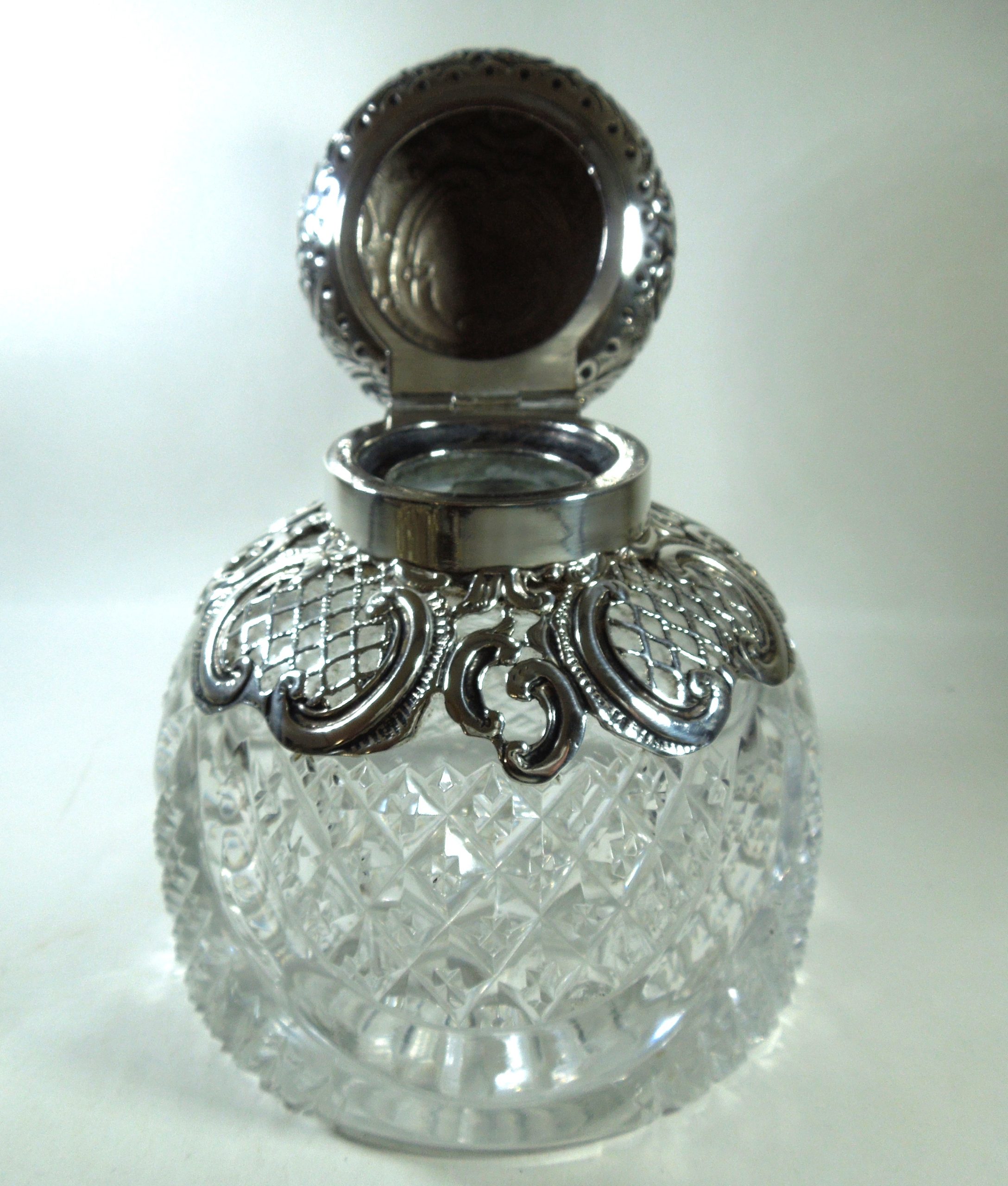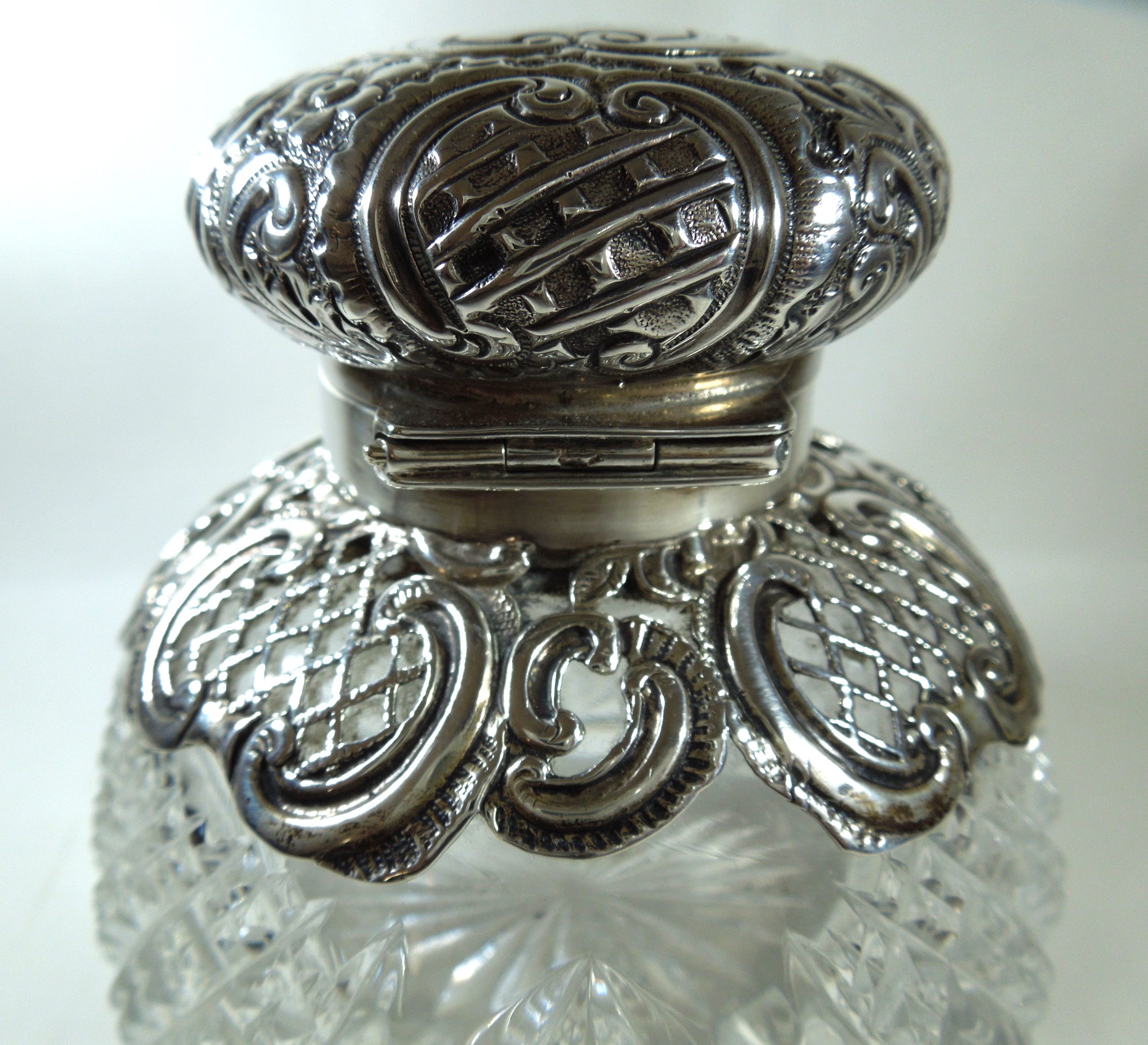 The top of the domed lid has a Griffon engraved on it. There is some floral decoration to the lid amongst detailed scroll patterning. The silver fretwork covers approximately one third of the crystal base. Aside from a small dent to the left of the lid, the silver is in a very good condition. The hinge is secure which is important. There is a very tiny chip to the base of the crystal which is barely noticeable to the naked eye.