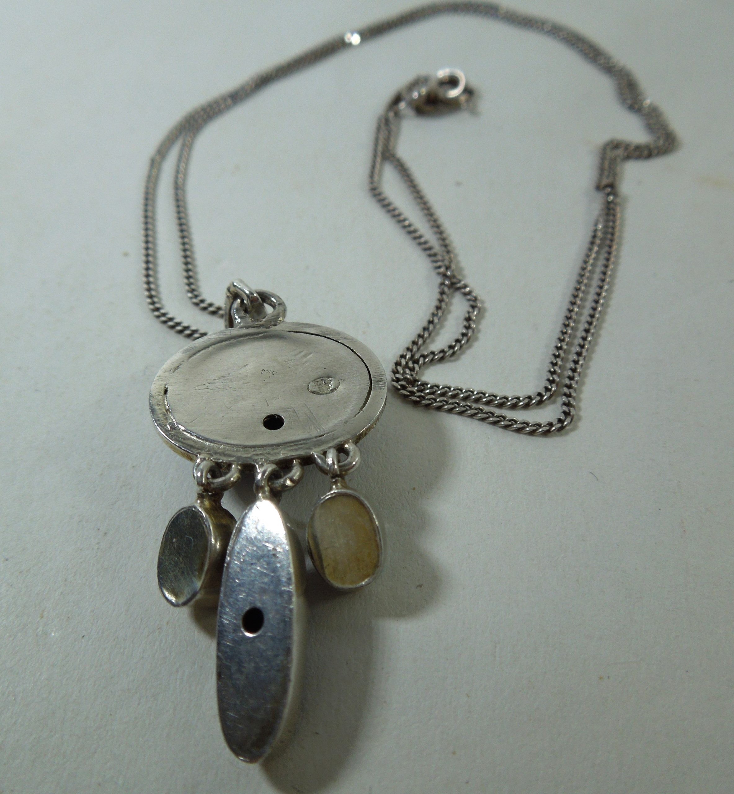 This unusual piece measures 4cm in length including the bale x 1.8cm wide and comes on a 46cm (18”) silver chain. The back of the pendant has a crown stamp indicating silver and is probably of European origin.