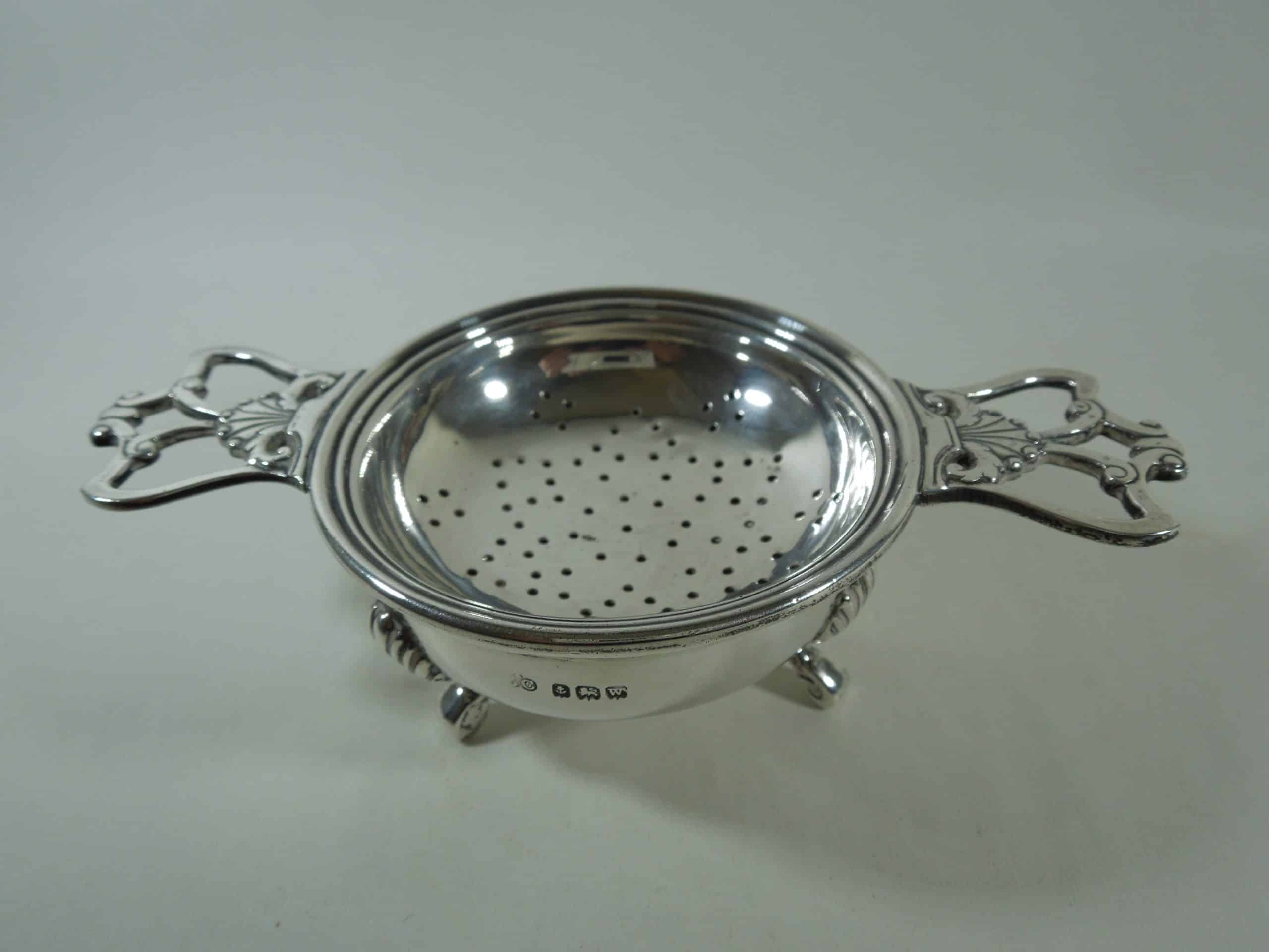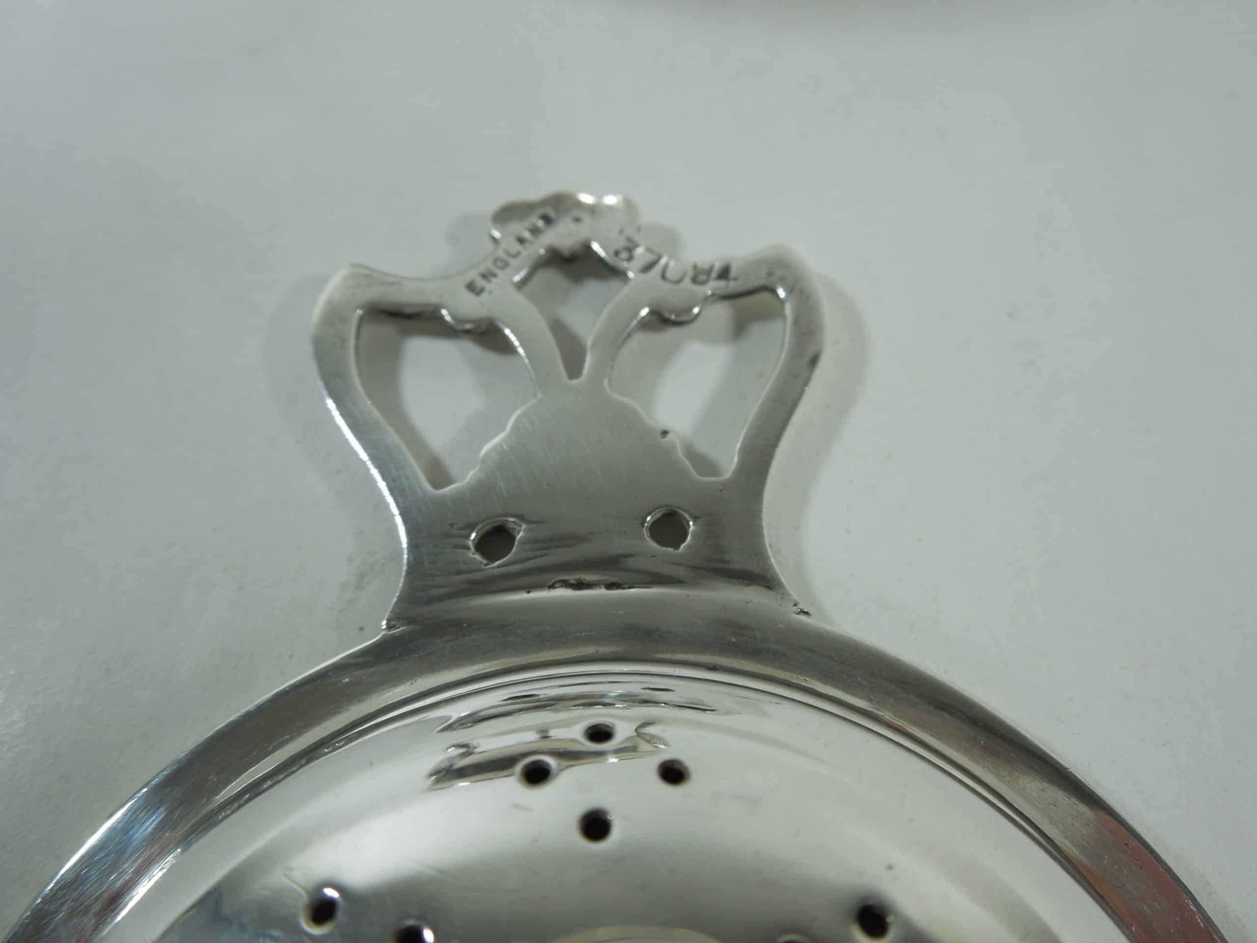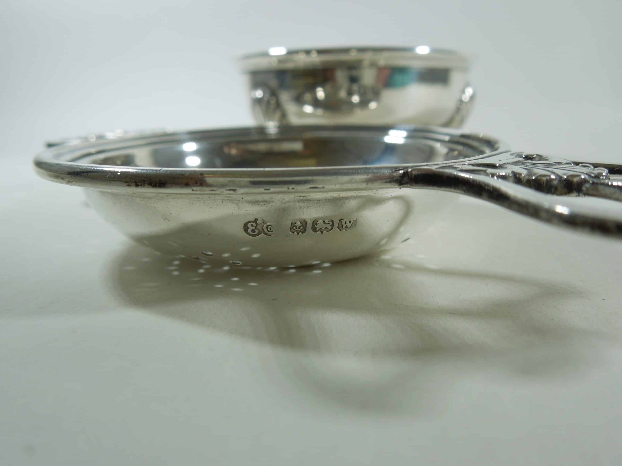 Solid silver tea strainer with drip bowl, hallmarked in Birmingham 1921. The maker’s marks are E & Co for Elkington and Company Ltd.
