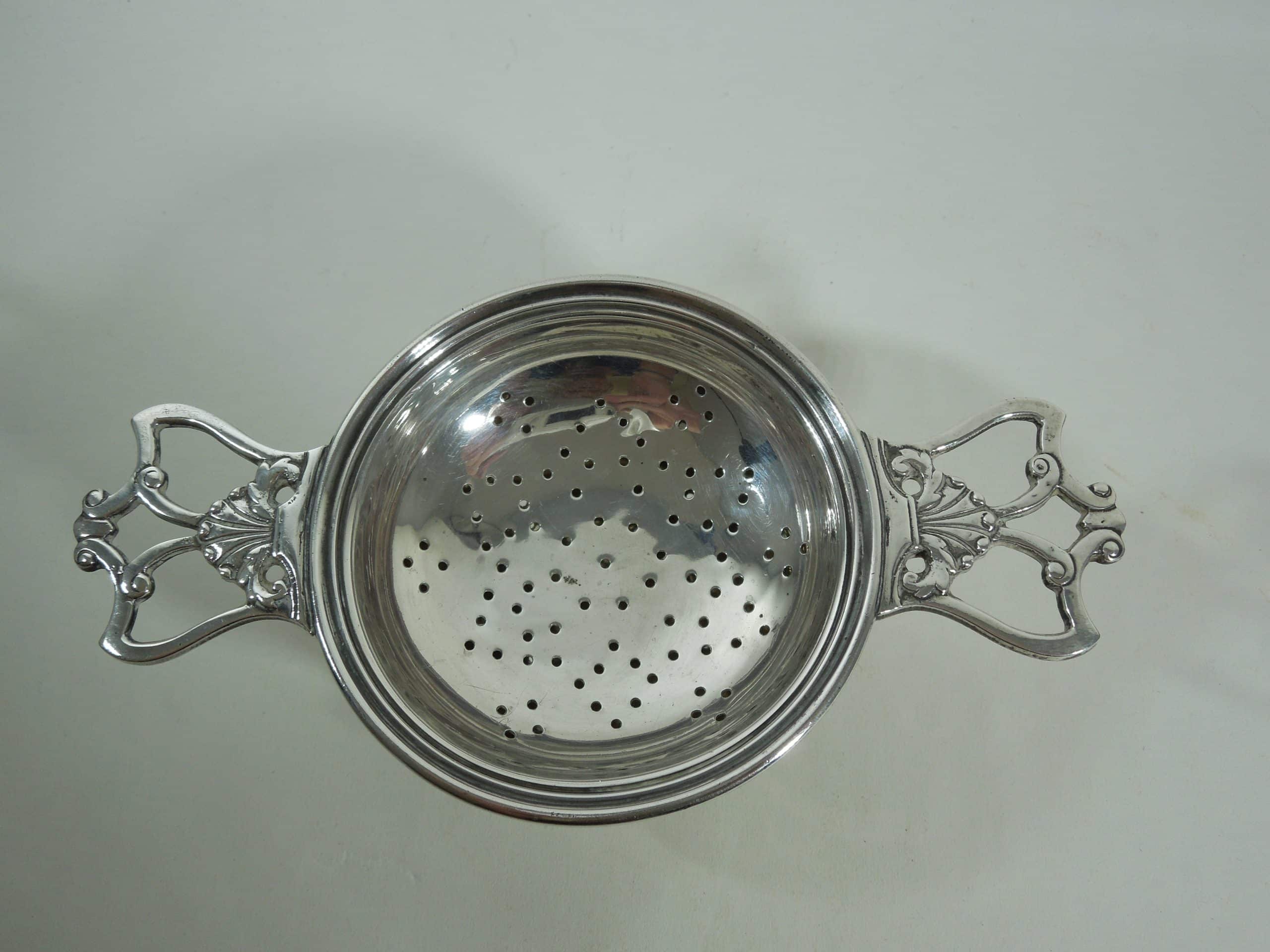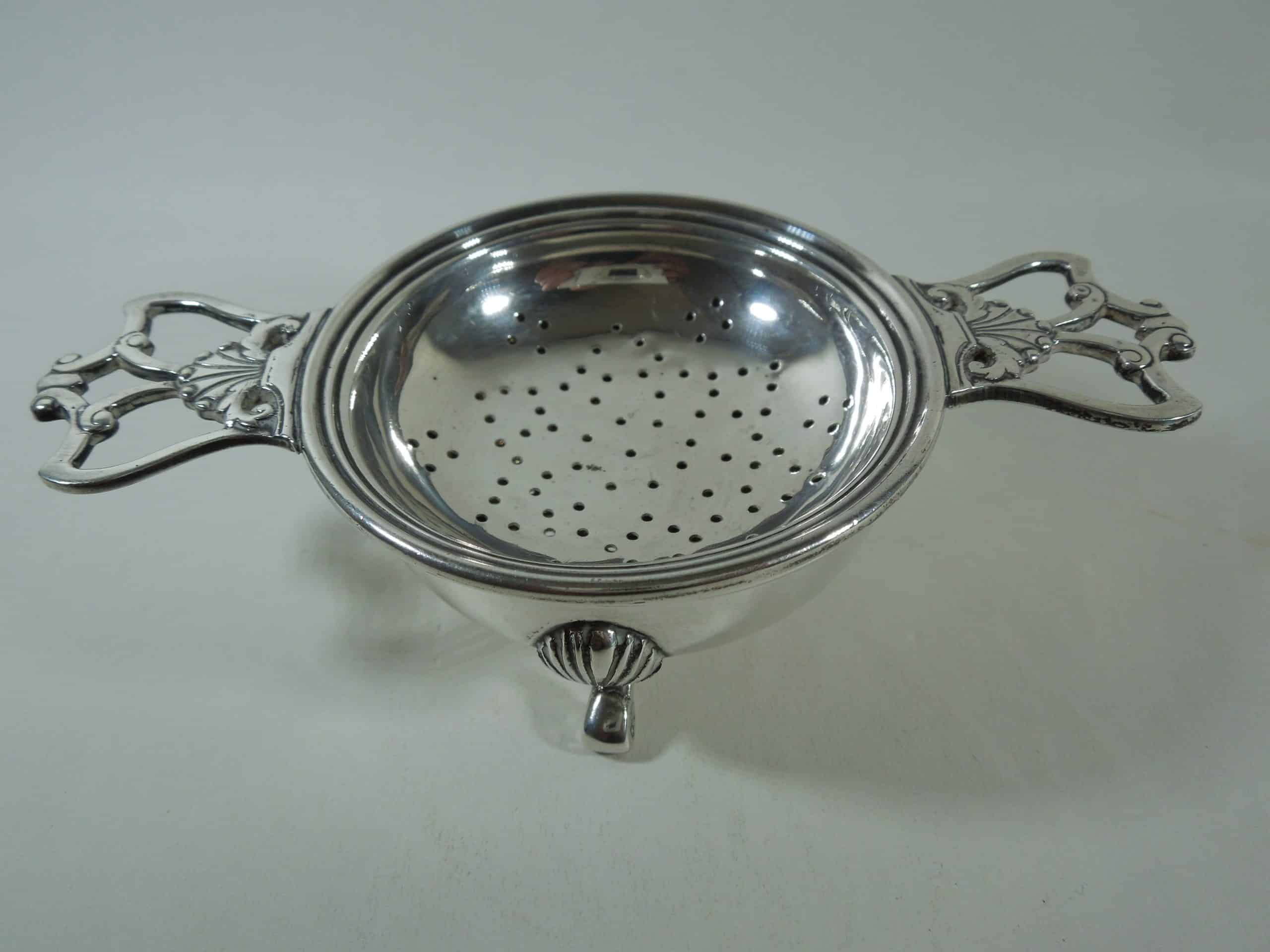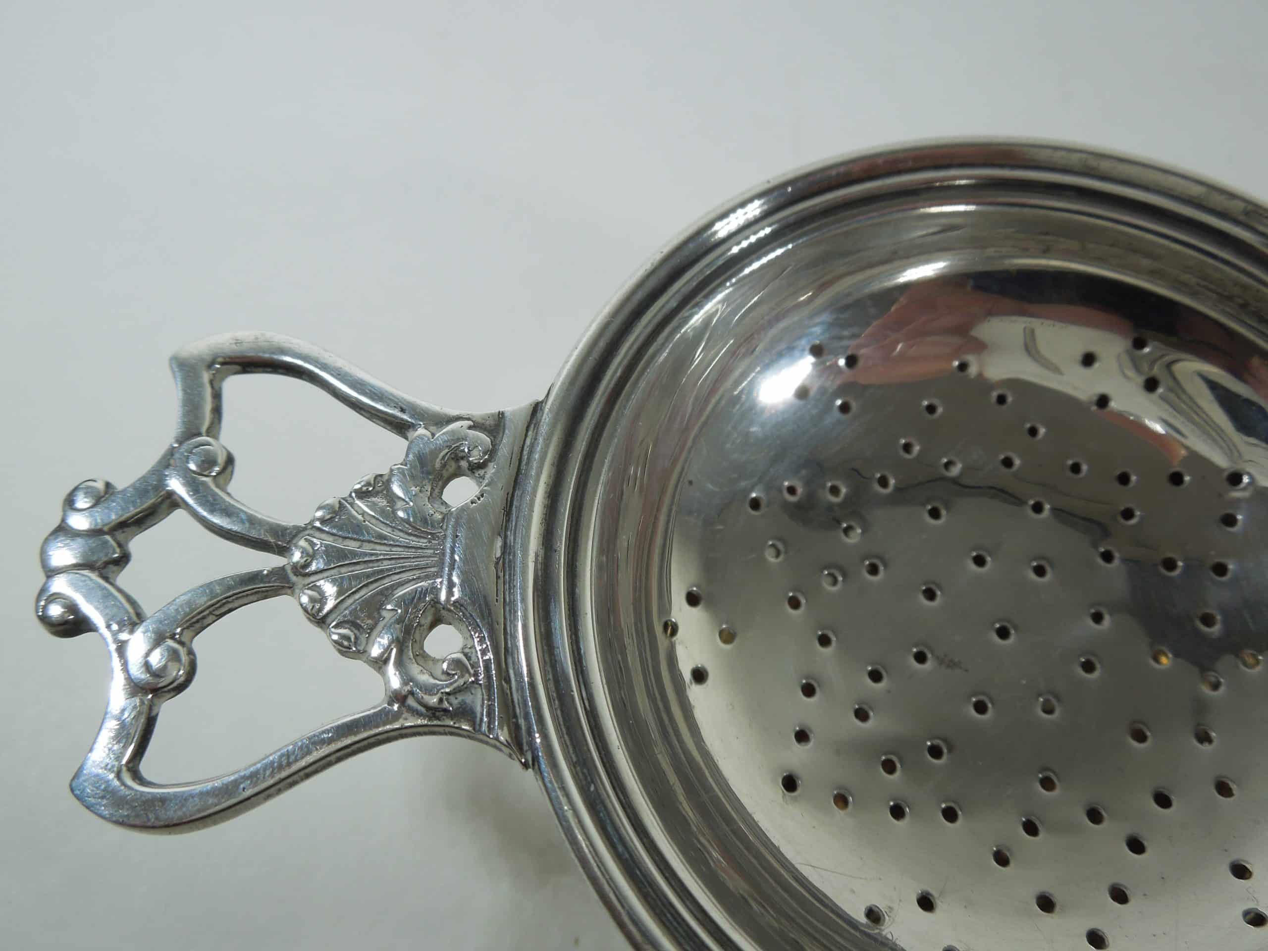 Solid silver tea strainer with drip bowl, hallmarked in Birmingham 1921. The maker’s marks are E & Co for Elkington and Company Ltd.