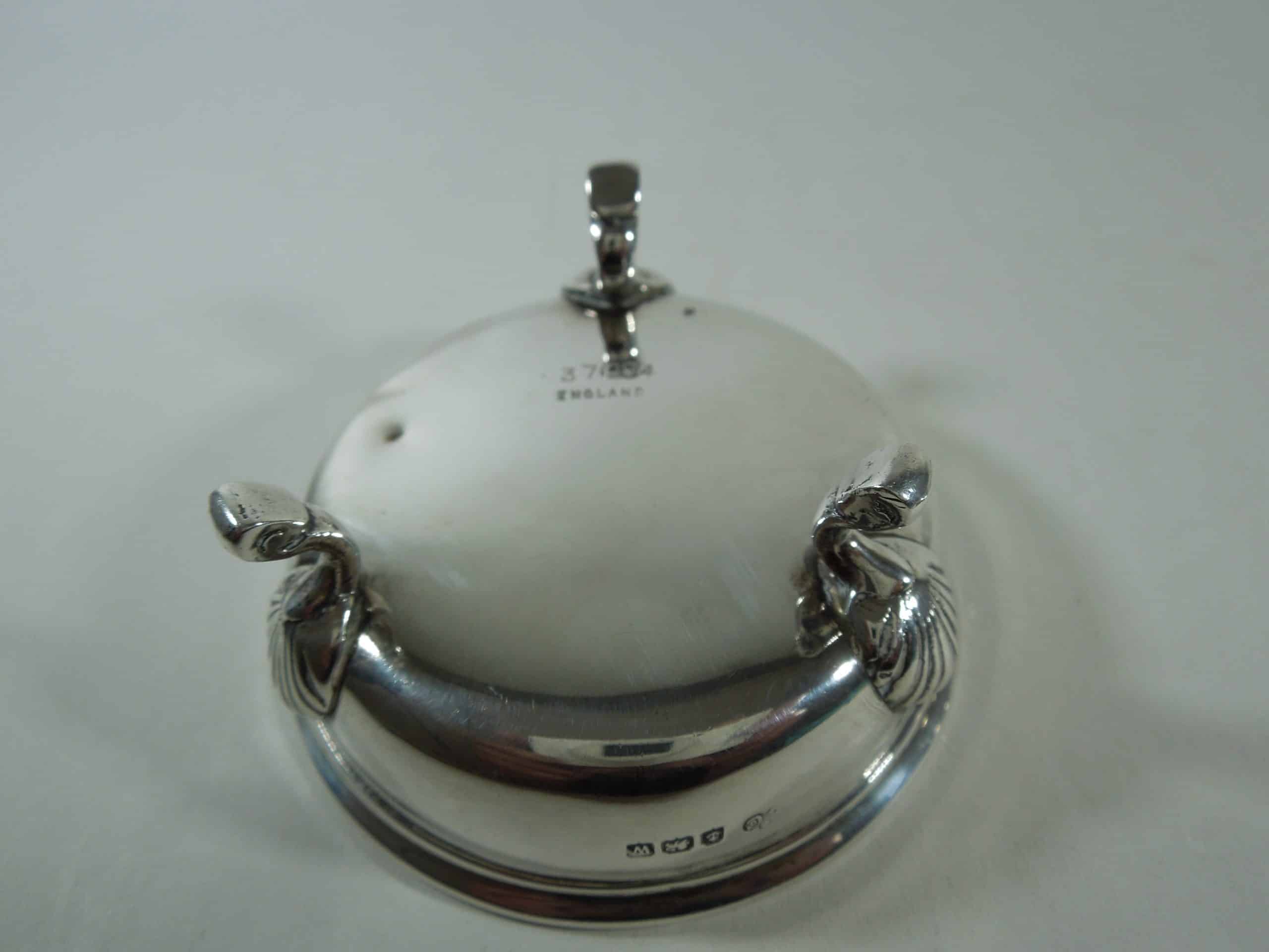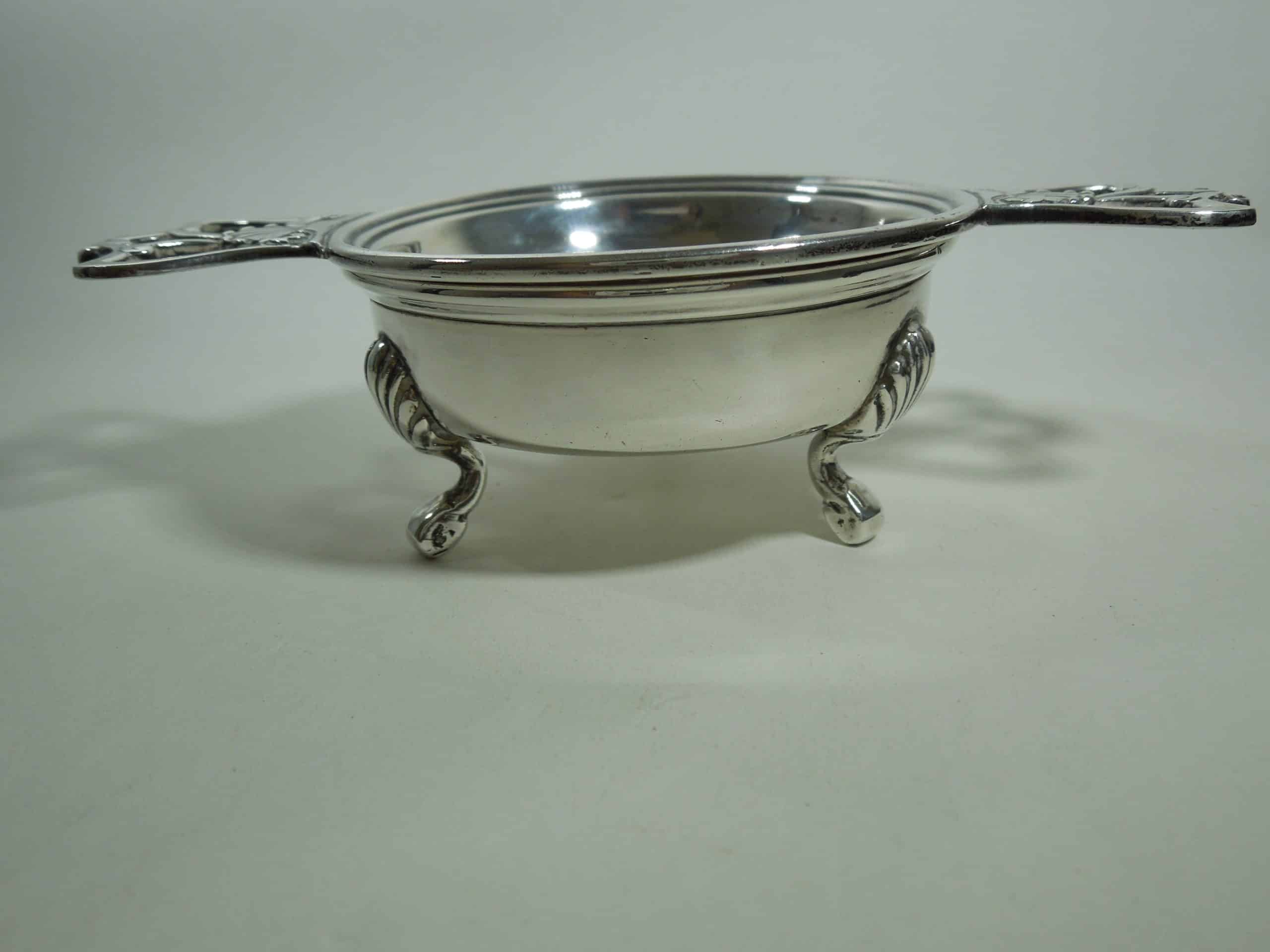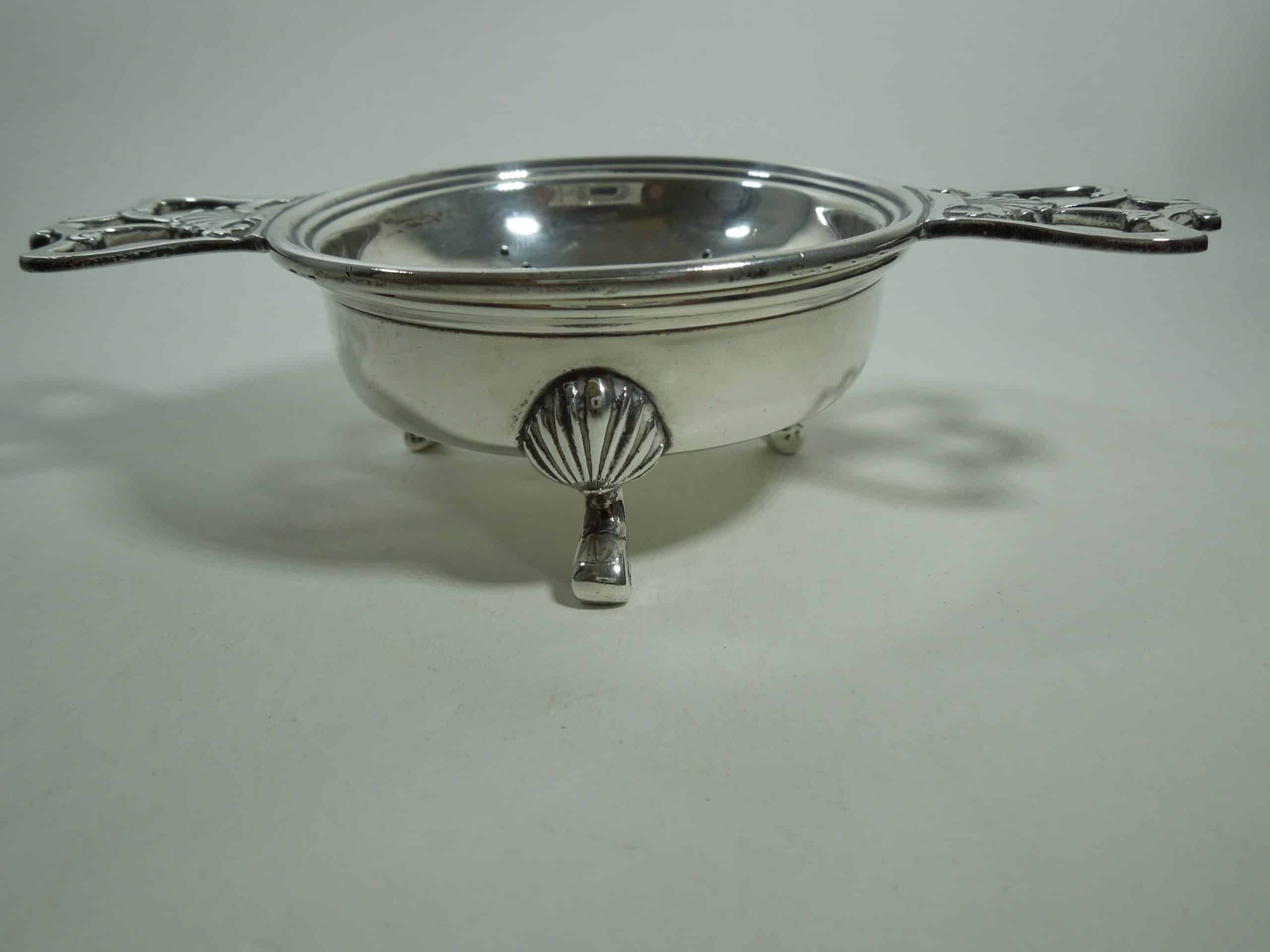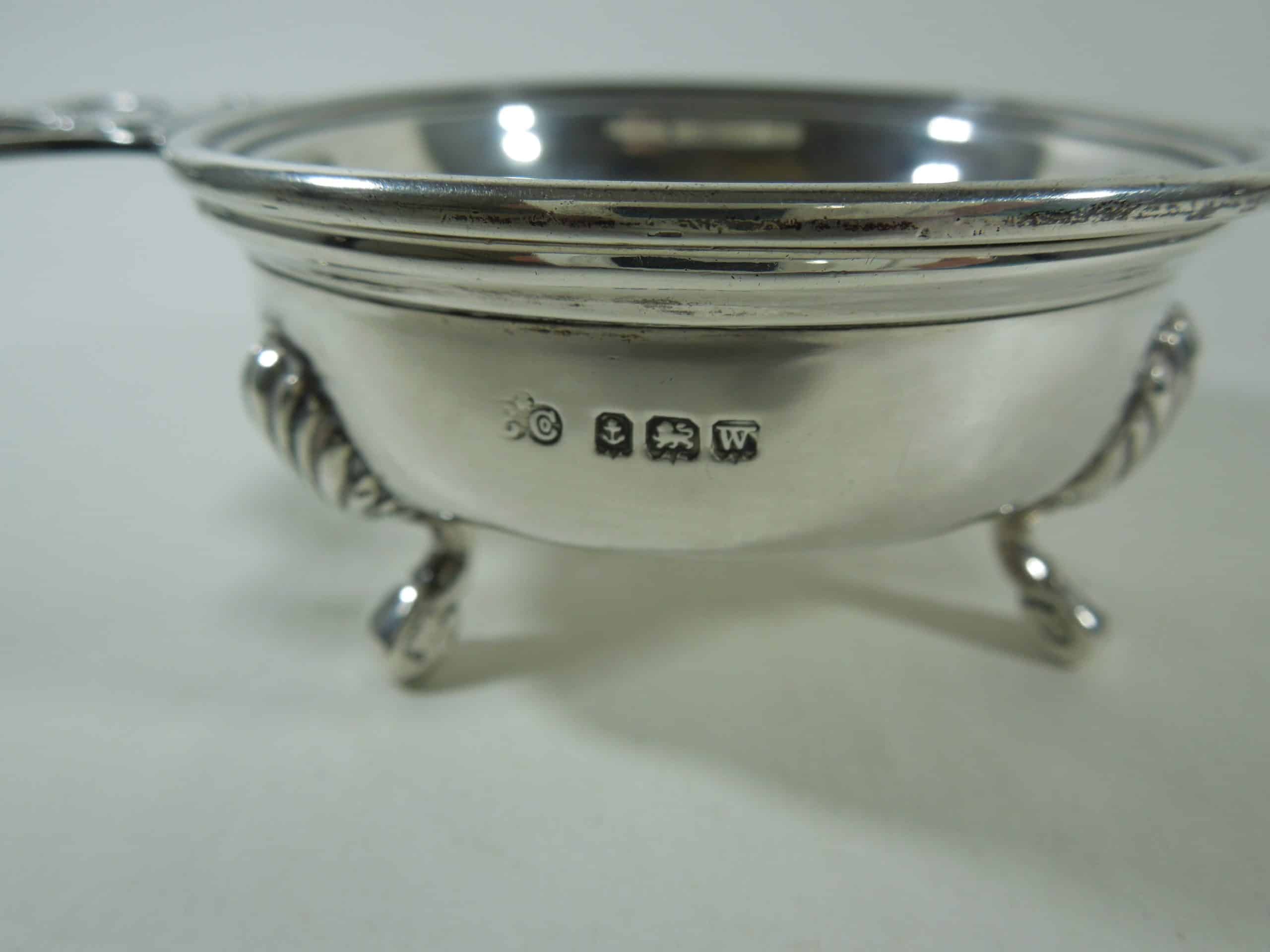 The strainer sits on a silver bowl with 3 shell-shaped feet and which is also hallmarked Birmingham 1921. It’s not uncommon for tea strainers to become seperated from their original drip bowls and this is a fine example of an original pair. The strainer measures 12.5cm from handle to handle and the bowl 6.5cm in diameter. It has a good weight at 88.9 grams.