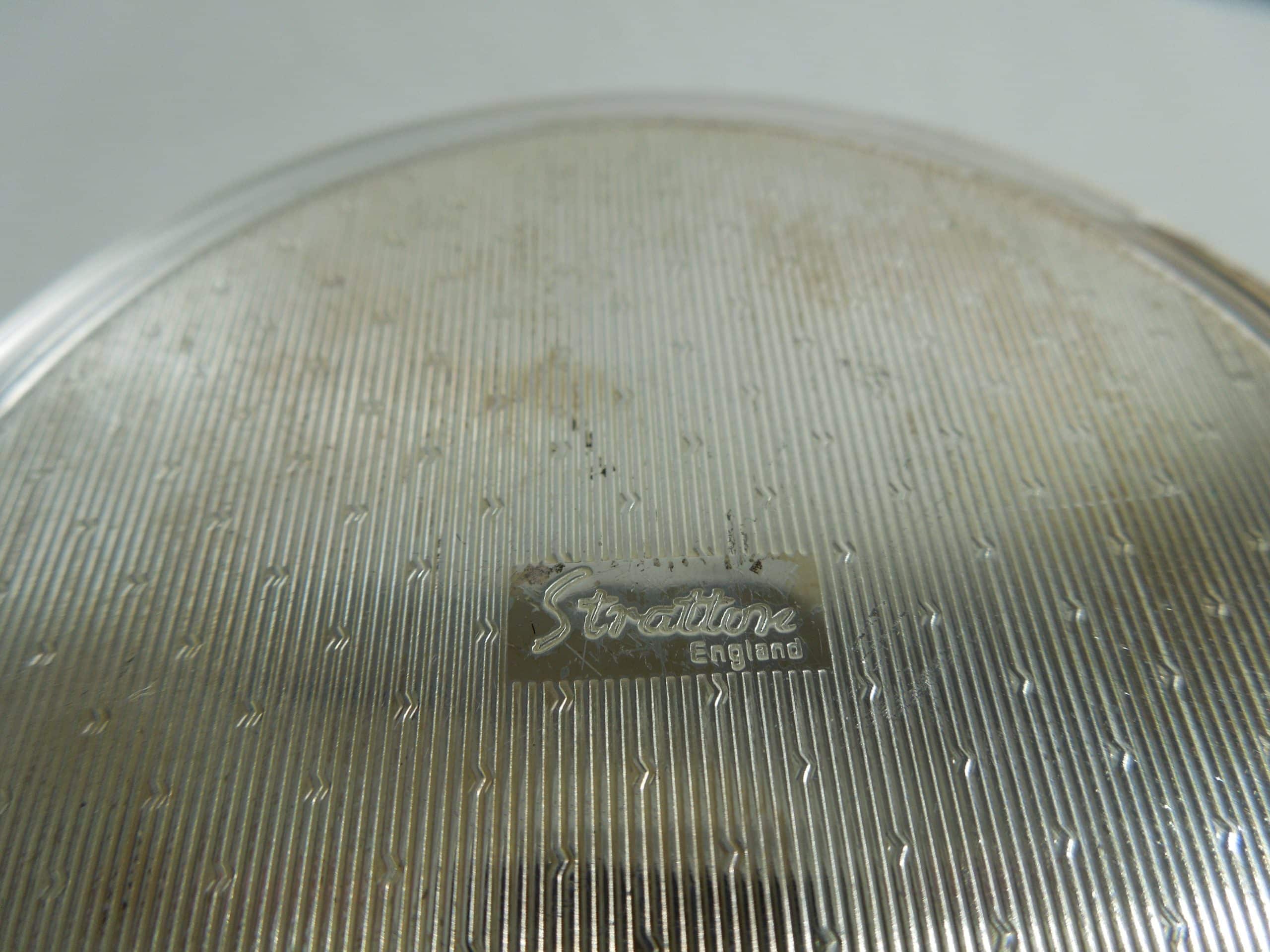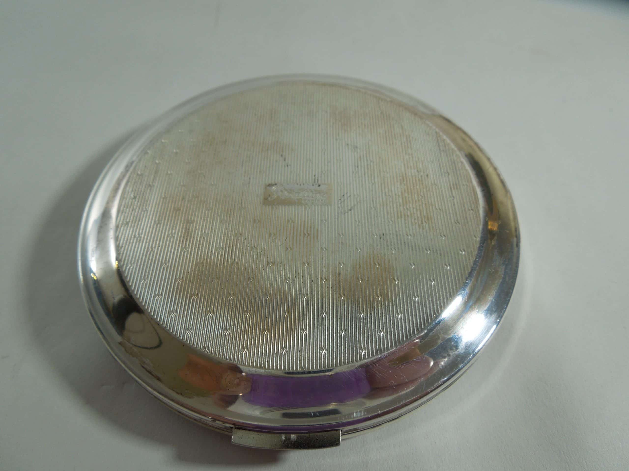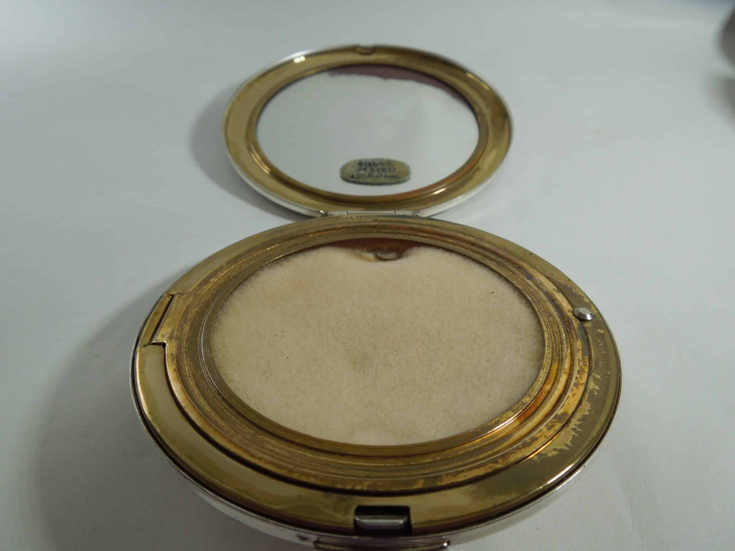 The mirror has a small section of moisture damage at the top where the silver backing has come away. The original ‘silver plated’ label is still attached to the mirror. The enamel work is perfect with no chips or cracks. It’s quite large by normal compact standards, mesuring 8.5cm in diameter.