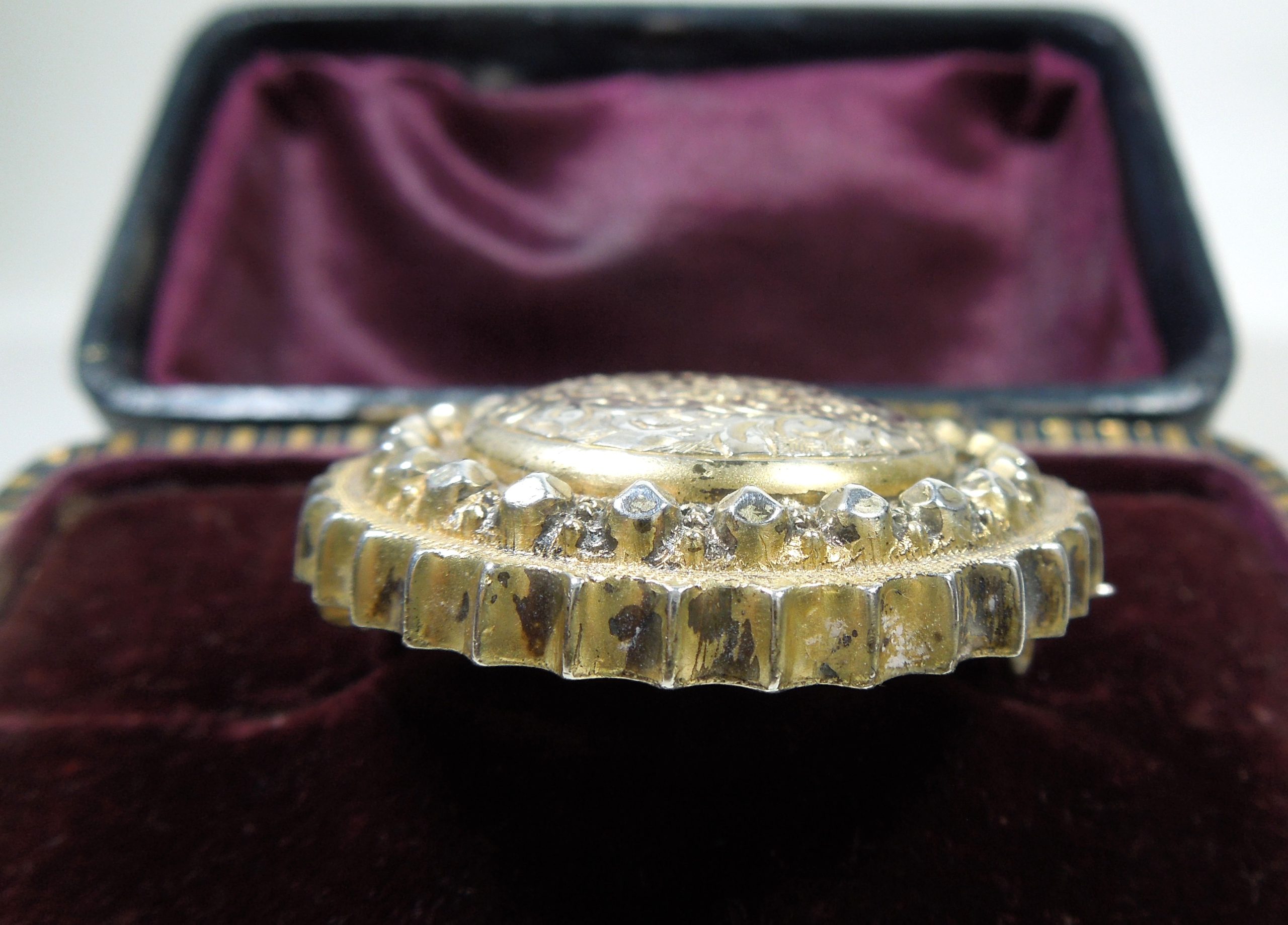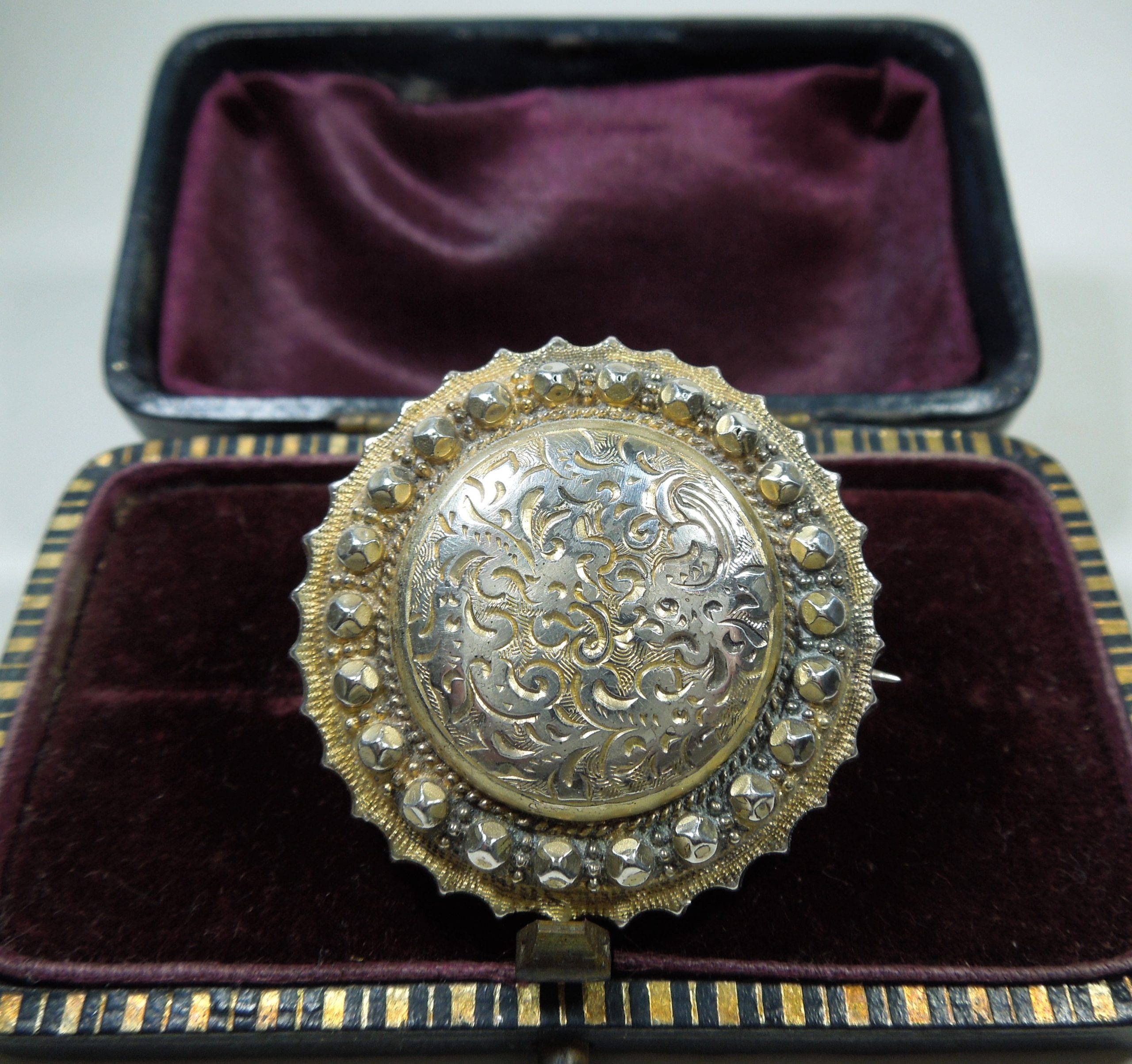 Pretty circular Victorian period silver brooch with subtle gilt. Decorated with detailed scroll work done by hand in the centre, it’s very likely that it once had a glass section at the back to house a photo or lock of hair.